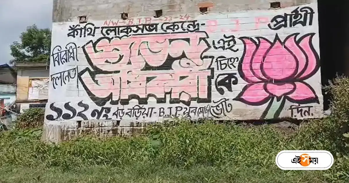 ঘটনাস্থল পূর্ব মেদিনীপুরে কাঁথি লোকসভা কেন্দ্রের অন্তর্গত ভগবানপুর। সেখানেই একটি দেওয়াল লিখনে দেখা গেল লোকসভা নির্বাচনে বিজেপি প্রার্থী শুভেন্দু অধিকারীকে ভোট দেওয়ার আবেদন। দেওয়াল পদ্মফুলের প্রতীক-সহ লেখা, ‘কাঁথি লোকসভা কেন্দ্রে বিজেপি প্রার্থী বিরোধী দলনেতা শুভেন্দু অধিকারীকে এই চিহ্নে ভোট দিন।’ নিচে আরও লেখা, ‘১১২ নম্বর বড়বড়িয়া বিজেপি যুব মোর্চা।’