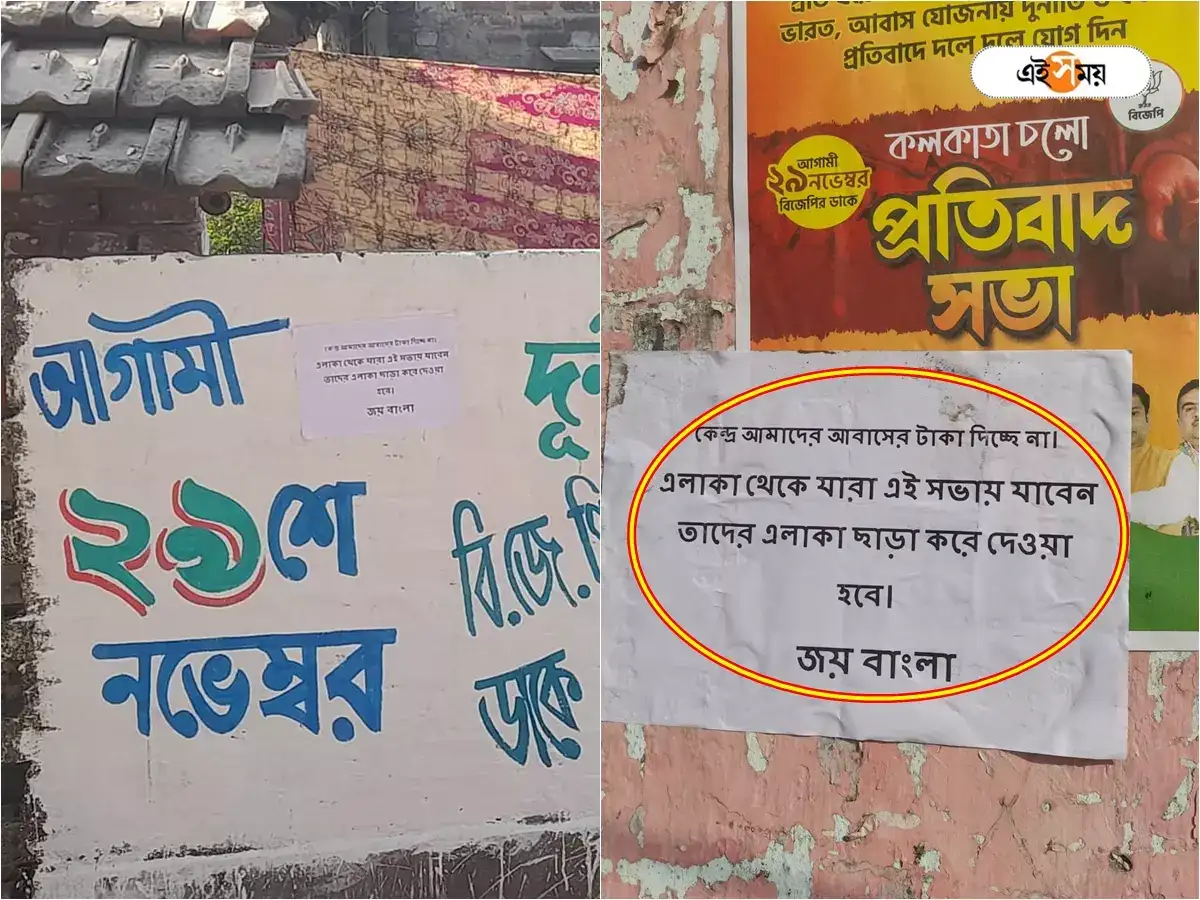 ‘BJPর ধর্মতলা সভায় গেলে এলাকা ছাড়া করে দেওয়া হবে’, এই মর্মে পোস্টার ঘিরে রাজনৈতিক তরজা কেওটায়। হুগলি চুঁচুড়া পুরসভার এক নম্বর ওয়ার্ড কেওটা বটতলা এলাকায় রবিবার সকালে এই ধরনের পোস্টার দেখা যায়। আগামী ২৯ নভেম্বর ‘কলকাতা চলো’র ডাক দিয়েছে BJP।ওই দিন ধর্মতলায় হবে প্রতিবাদ সভা। সেই সভায় যোগ দেওয়ার আহ্বান জানিয়ে পোস্টার মারা হয়েছে বিভিন্ন জায়গায়। হুগলি চুঁচুড়া ব্যান্ডেলেও পোস্টার মারা হয়। BJPর সেই পোস্টারের উপর সাদা কাগজে ছাপানো লেখা পোস্টার মারা হয়েছে। তাতে লেখা কেন্দ্র আমাদের আবাসের টাকা দিচ্ছে না। এলাকা থেকে যারা এই সভায় যাবেন তাদের এলাকা ছাড়া করে দেওয়া হবে। তলায় লেখা জয় বাংলা। আজ সকালে স্থানীয়দের নজরে পড়ে এই পোস্টার। যা নিয়ে শুরু হয়েছে রাজনৈতিক তরজা ।