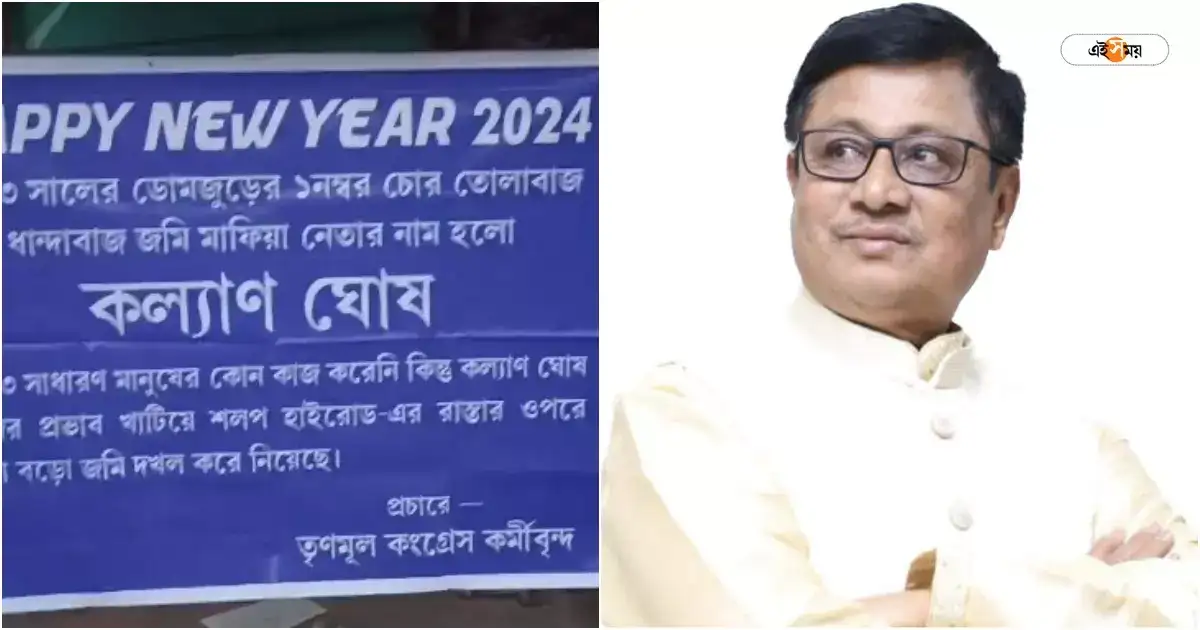 হাওড়ার ডোমজুড়ের বাঁকরা এলাকায় বাসিন্দারা জানাচ্ছেন, কয়েকটি জায়গায় একটি ব্যানার তাঁদের নজরে এসেছে। সেই ব্যানারে লেখা, ‘HAPPY NEW YEAR 2024, ২০২৩ সালের ডোমজুড়ের ১ নম্বর চোর তোলাবাজ ধান্দাবাজ জমি মাফিয়া নেতার নাম হল কল্যাণ ঘোষ।’ ব্যানারের দ্বিতীয় অংশে লেখা, ‘২০২৩ সাধারণ মানুষের কোনও কাজ করেনি,কিন্তু কল্যাণ ঘোষ নিজের প্রবাব খাটিয়ে শলপ হাইরোড-এর রাস্তার ওপরে ১০টা বড় জমি দখল করে নিয়েছে।’ ব্যানারের একদম শেষ অংশে লেখা, ‘প্রচারে – তৃণমূল কংগ্রেস কর্মীবৃন্দ।’