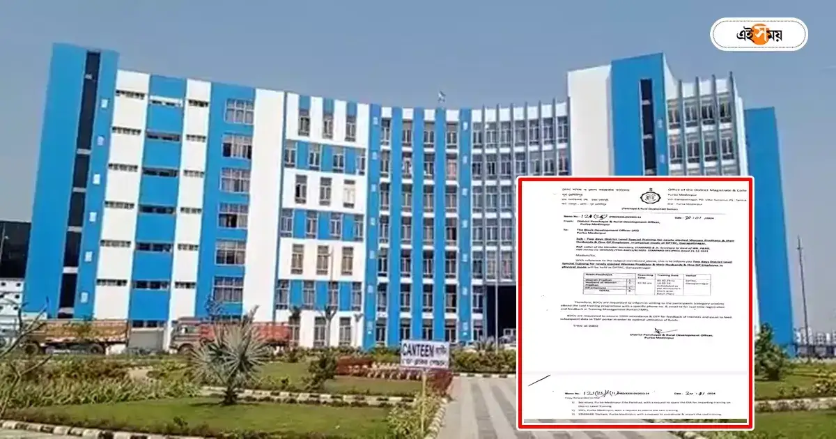 মঙ্গলবার পূর্ব মেদিনীপুর জেলা পঞ্চায়েত ও গ্রামোন্নয়ন আধিকারিক একটি নোটিশ জারি করেছেন এই মর্মে। সেখানে বলা হয়েছে, ৫ থেকে ১০ ফেব্রুয়ারি তমলুকের নিমতৌড়িতে জেলাশাসকের দফতরে জেলার মহিলা গ্রাম পঞ্চায়েত প্রধান ও তাঁদের স্বামীদের প্রশিক্ষণ দেওয়া হবে। সেই সঙ্গে থাকবেন গ্রাম পঞ্চায়েতের একজন করে কর্মী।