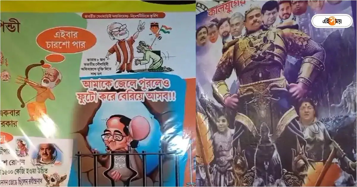 প্রধানমন্ত্রী থেকে শুরু করে মুখ্যমন্ত্রী এমনকী উত্তরপ্রদেশের মুখ্যমন্ত্রীরও ব্যঙ্গচিত্র রয়েছে মণ্ডপসজ্জায়। এক পুজো কমিটির অন্যতম উদ্যোক্তা তথা তৃণমূল নেতা বুদ্ধ মণ্ডল বলেন, ‘ব্যঙ্গচিত্র মেদিনীপুর শহরের ঐতিহ্য। প্রতিবছর মানুষ এই ব্যঙ্গচিত্র উপভোগ করার জন্যই আসেন।’ অন্যদিকে জেলা বিজেপির মুখপাত্র অরূপ দাস বলেন, ‘ব্যঙ্গচিত্র দেখে সিরিয়াস হওয়ার কোনও বিষয় নেই। মানুষ আনন্দ পাক এটাই সবার কাম্য।’ তবে ব্যঙ্গচিত্রকে ঘিরে লড়াই যাই থাকুক না কেন, মেদিনীপুর কলেজ মাঠে সরস্বতী পুজোকে কেন্দ্র করে মিলেমিশে একাকার হয়ে যান সমস্ত রাজনৈতিক দলের নেতা-নেত্রীরাই। লোকসভা নির্বাচনের আগেও সেই সৌভ্রাতৃত্বের ছবিতে কোনওরকম পরিবর্তন আসবে না বলেই মত জেলার রাজনৈতিকমহলের।