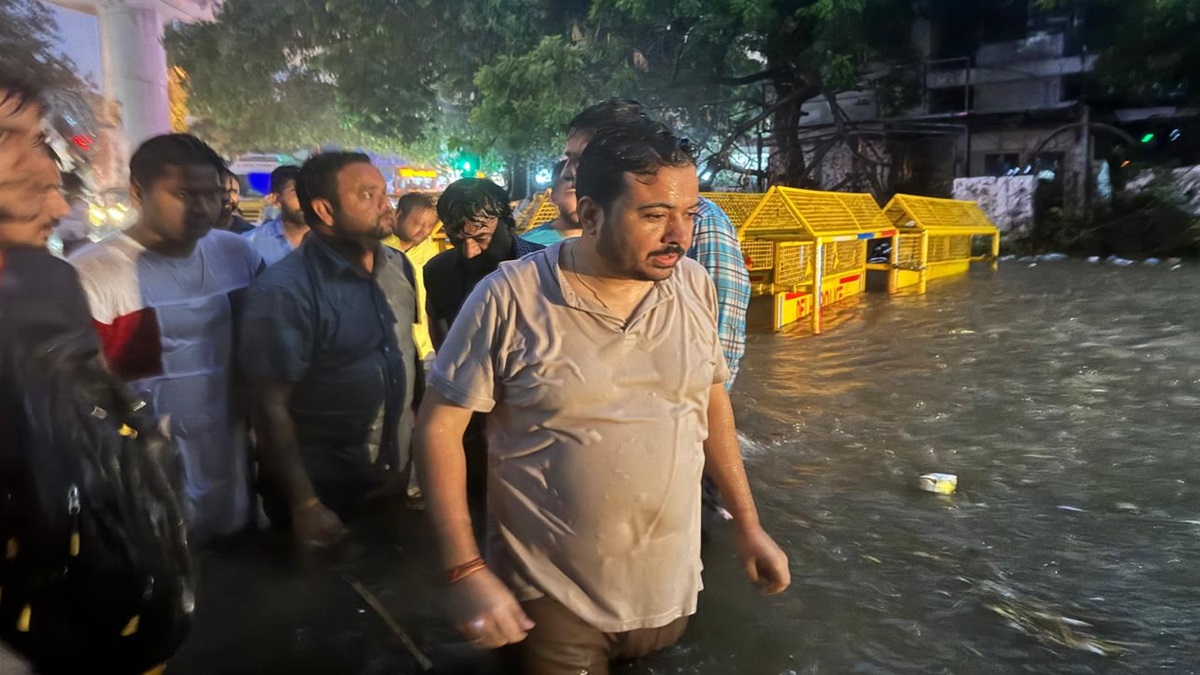 आप विधायक दुर्गेश पाठक ओल्ड राजेंद्र नगर में पानी निकासी का इंतजाम देखते हुए