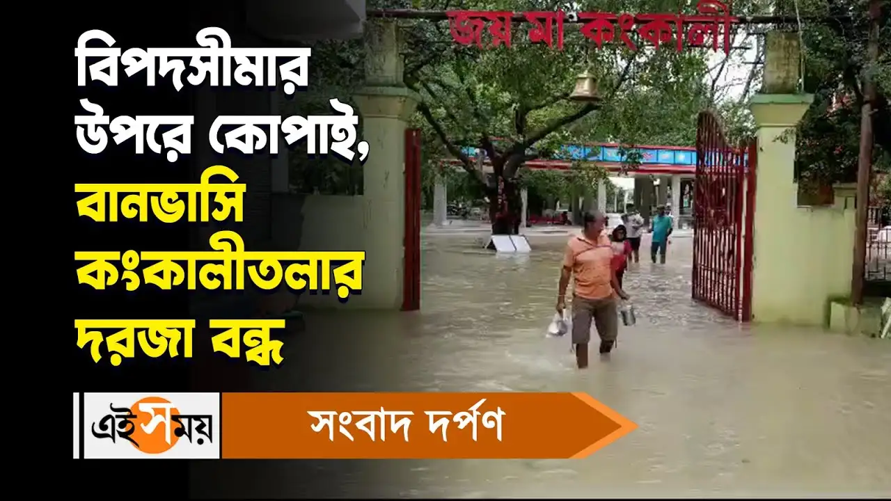 দক্ষিণবঙ্গে ভারী বর্ষণের ফলে একাধিক জেলার একাধিক অঞ্চল বানভাসি। নদীর জল উপচে ভাসিয়ে দিয়েছে দুই পাড়ের অঞ্চল। বিপদসীমার উপর দিয়ে বইছে বোলপুরের কোপাই নদীও। কোপাইয়ের জলে বানভাসি কংকালীতলা। কোপাইয়ের জল উপচে ভরে গিয়েছে কংকালী তলার মন্দির চত্বর। একটানা বৃষ্টিতে বেড়েছে কোপাইয়ের জলস্তর। পাড় ছাপিয়ে মন্দিরের ভিতরেও হাঁটু জল। সকালে সে অবস্থাতে মন্দির খোলা থাকলেও বেলা বাড়তেই বাড়ে সমস্যা। মন্দির কর্তৃপক্ষ দরজা বন্ধ করার সিদ্ধান্ত নেন। মন্দিরের মূল ঘরেও জল ঢুকে পড়ার আশঙ্কা। জলের কারণে বন্ধ মন্দির চত্বরের একাধিক দোকান। যদিও তার মধ্যেই পুন্যার্থীদের মন্দিরে পুজো দিতে আসতে দেখা গিয়েছে। যদিও অন্য দিনের থেকে মন্দিরে ভক্তসংখ্যা ছিল অনেক কম। বেলায় জল আরও বাড়তে বন্ধ করা হয় মন্দিরের কপাট। সন্ধের মধ্যে জল না নামলে কংকালী মাকেও সরানো হতে পারে বলে মন্দির সূত্রে খবর। শনিবার মন্দির ভক্তদের জন্য বন্ধ থাকবে কিনা সে সম্পর্কে কিছু জানা যায়নি। এখন মন্দির চত্বর থেকে জল নামার জন্য বৃষ্টির তোড় কমার অপেক্ষা ছাড়া আর কিছুই করার নেই বলে দাবি স্থানীয় দোকানদারদের।