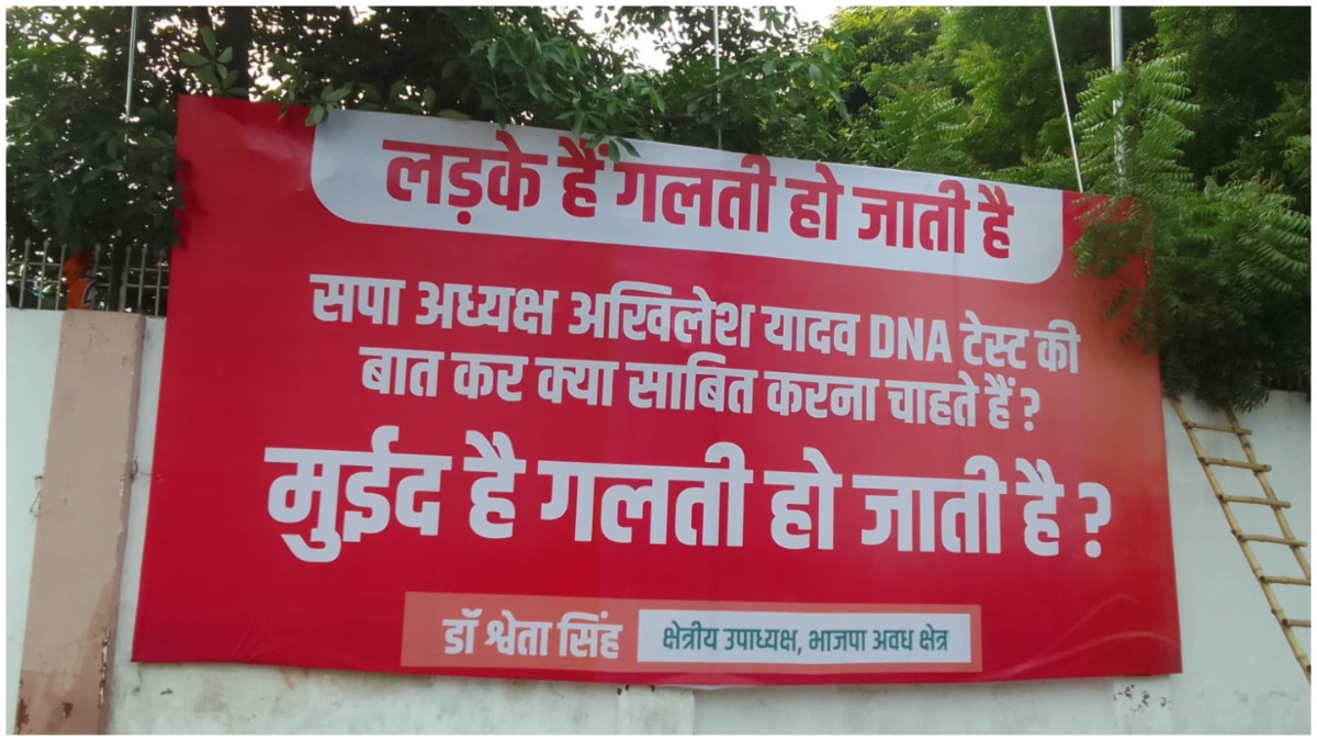 भाजपा नेता श्वेता सिंह द्वारा लगाए गए इस होर्डिंग में सपा पर हमला किया गया है। लाल रंगे के होर्डिंग में लिखा गया है, “लड़के हैं गलती हो जाती है। सपा अध्यक्ष अखिलेश यादव डीएनए टेस्ट की बात कर क्या साबित करना चाहते हैं? मुईद है गलती हो जाती है?” बता दें कि श्वेता सिंह भाजपा की अवध क्षेत्र की क्षेत्रीय उपाध्यक्ष भी हैं। पहले यह समाजवादी पार्टी में थी, लेकिन साल 2017 के विधानसभा चुनाव में लखनऊ से समाजवादी पार्टी के सिंबल पर टिकट मांग रही थीं, लेकिन टिकट नहीं मिल पाने के कारण वह भाजपा में शामिल हो गईं।