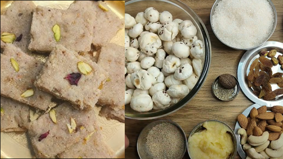 छठा स्टेप- बैटर को फैलाकर अच्छी तरह से सेट कर लें और फिर इसे ठंडा होने के लिए रख दें। हल्का ठंडा होने के बाद इसे अपनी पसंदीदा शेप में काट दें। तैयार है मखाना मेवा पाग। इस मिठाई को व्रत में भी खा सकते हैं।