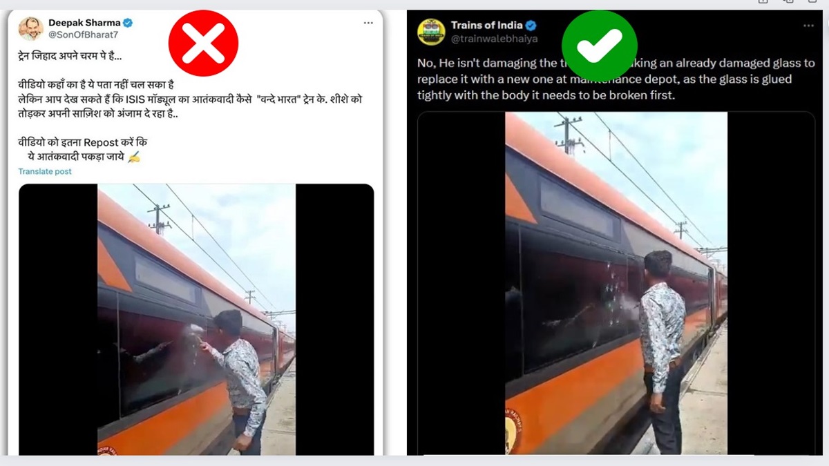 वीडियो को सोशल मीडिया प्लेटफॉर्म एक्स पर पोस्ट करते हुए एक यूजर ने लिखा है, ”ट्रेन जिहाद अपने चरम पे है… वीडियो कहाँ का है ये पता नहीं चल सका है लेकिन आप देख सकते हैं कि ISIS मॉड्यूल का आतंकवादी कैसे “वन्दे भारत” ट्रेन के। शीशे को तोड़कर अपनी साज़िश को अंजाम दे रहा है.. शीशे को तोड़कर अपनी साज़िश को अंजाम दे रहा है.. वीडियो को इतना Repost करें कि ये आतंकवादी पकड़ा जाये।” इसी तरह के कैप्शन के साथ वीडियो को फेसबुक और इंस्टाग्राम पर सैकड़ों लोग शेयर कर चुके हैं।