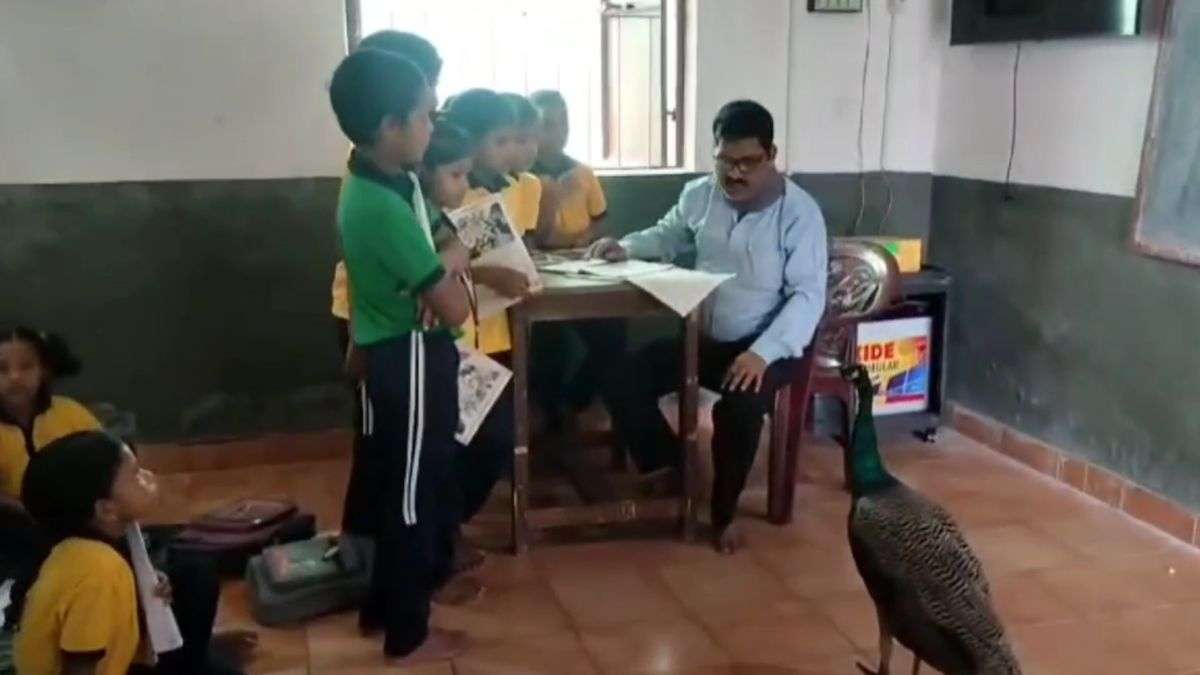 ओडिशा के रायगड़ा के टिकरी गांव में गोकुलमुंडा स्कूल है। यहां के एक स्कूल में टीचर बच्चों की क्लास ले रहे थे। इसी दौरान क्लास में मोर आ गया। मोर को देख सभी बच्चे भी उत्साहित हो गए। इस दौरान टीचर ने भी मजाक किया और मोर से पूछा कि क्या तू भी पढ़ेगा?