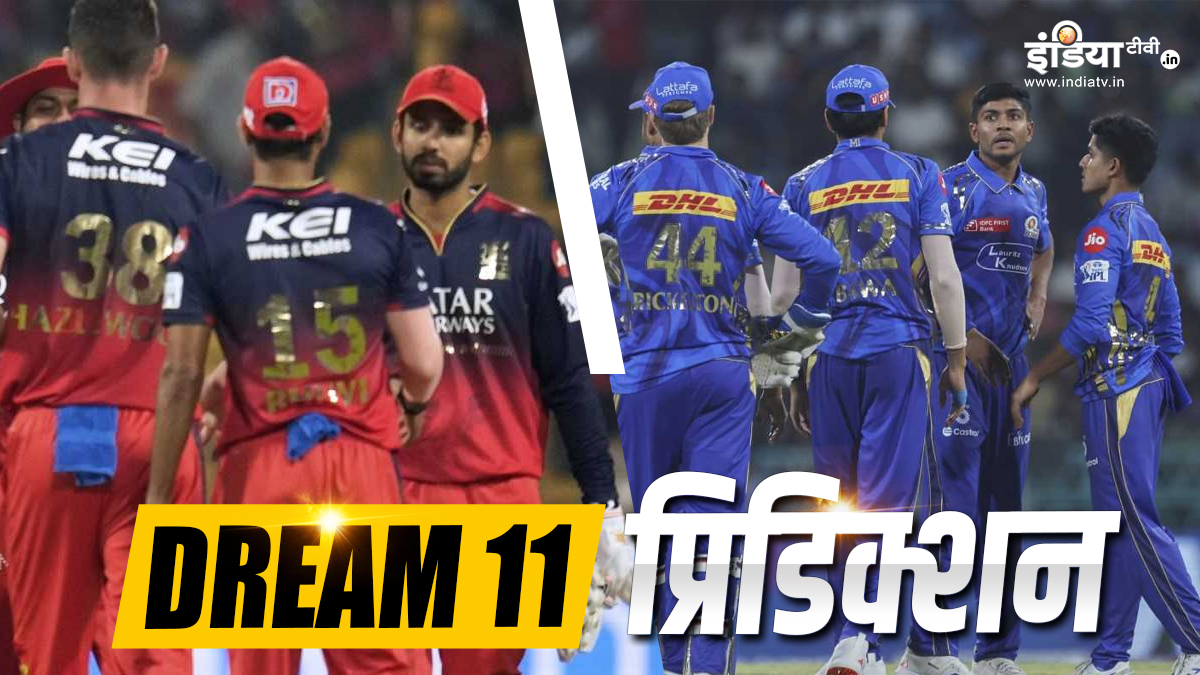 मुंबई इंडियंस और रॉयल चैलेंजर्स बेंगलुरु के बीच खेले जाने वाले इस मुकाबले की Dream11 टीम को लेकर बात की जाए तो उसमें आप 2 विकेटकीपर को शामिल कर सकते हैं, जिसमें फिल सॉल्ट और रेयान रिकेल्टन का नाम शामिल है। वहीं बल्लेबाजों के विकल्प में से आप तीन प्लेयर्स को चुन सकते हैं, इसमें विराट कोहली, रजत पाटीदार और सूर्यकुमार यादव का नाम शामिल है। ऑलराउंडर प्लेयर्स में आप 3 प्लेयर्स चुन सकते हैं जो हार्दिक पांड्या के अलावा लियम लिविंगस्टन और नमन धीर हैं। वहीं गेंदबाजों के विकल्प में से आप जोश हेजलवुड, भुवनेश्वर कुमार के साथ पूरी तरह फिट होकर मैदान पर वापसी कर रहे जसप्रीत बुमराह को चुन सकते हैं। आप अपनी इस Dream11 टीम में कप्तान के तौर पर विराट कोहली को चुन सकते हैं, जिनका अब तक फॉर्म इस सीजन बल्ले से अच्छा देखने को मिला है। वहीं उपकप्तान आप सूर्यकुमार यादव को बना सकते हैं।