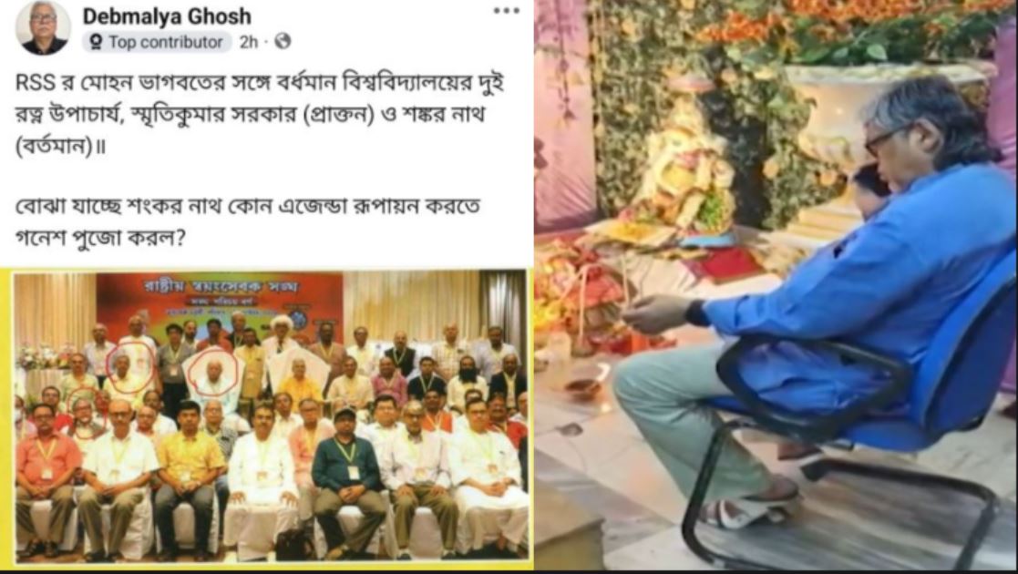 এবছর গণেশ পুজো হয়েছে বর্ধমাব বিশ্ববিদ্যালয়েও। আয়োজক, উপাচার্য শঙ্করকুমার নাথ। বুধবার বিশ্ববিদ্যালয়ের প্রশাসনিক ভবনে উপাচার্যের ঘরের সামনেই রীতিমতো ম্যারাপ বেঁধে পুজোর আয়োজন তিনি। ডেকোরেশন থেকে পুরোহিত, ত্রুটি ছিল না এতটুকুও। আর সেই পুজোকে কেন্দ্র দানা বেঁধেছে বিতর্ক। এরমধ্যেই প্রকাশ্যে এল RSS প্রধান মোহন ভাগবতের সঙ্গে উপাচার্যের ছবি। যে ছবিতে দেখা যাচ্ছে প্রাক্তন উপাচার্য স্মৃতিকুমার সরকারকেও।