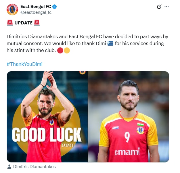 জি ২৪ ঘণ্টা ডিজিটাল ব্যুরো: ডুরান্ড ডার্বিতে জোড়া গোলের নায়ক ছিলেন তিনি। আর ডুরান্ড শেষ হতেই অতীত হয়ে গেলেন গ্রিক স্ট্রাইকার দিমিত্রিয়স দিয়ামান্টাকোস (Dimitrios Diamantakos)। ইস্টবেঙ্গল (East Bengal) এবং দিমির মৌখিক সম্মতিতেই বিচ্ছেদ হয়ে গেল। লেসলি ক্লডিয়াস সরণির শতাব্দী প্রাচীন ক্লাব সোমবার বিকালে, সোশাল মিডিয়ায় দিমিকে ‘গুড লাক’ জানিয়েই তাঁকে প্রাক্তন করে দিল। বলা যেতে পারে ভক্তদের ‘দিমি-গড’ নিয়ে মোহমুক্তি ঘটল! দিমির যে বিদায় আসন্ন, তেমনটা শোনাই যাচ্ছিল। শেষে জল্পনাই সত্যি প্রমাণিত হল!