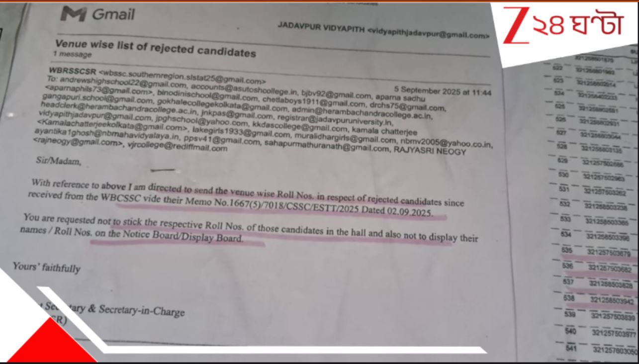 শ্রেয়সী গঙ্গোপাধ্যায়: রাত পোহালেই স্কুল সার্ভিস কমিশনের (এসএসসি) শিক্ষক নিয়োগ পরীক্ষা। ‘অযোগ্যদের মধ্যে পরীক্ষায় বসার জন্য আবেদন করেছিলেন, তাঁদের নাম বা রোল নম্বরে ভিত্তিতে যেন কোন বসার ব্যবস্থা না করা হয়’, পরীক্ষাকেন্দ্রে বাইরে ঝুলিয়ে দেওয়া হল নোটিশ। সঙ্গে নাম ও রোল নম্বরও। যাতে কোনওভাবেই অযোগ্যরা পরীক্ষাকেন্দ্রে ঢুকতে না পারেন।