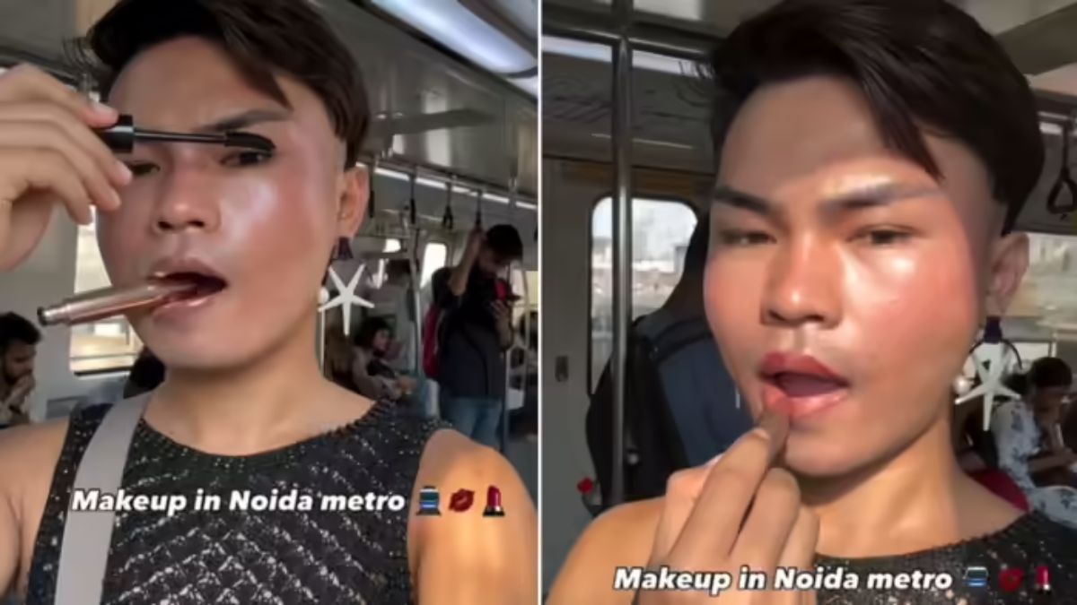 इस वीडियो को इंस्टाग्राम पर @a_g_o_u नामक हैंडल से शेयर किया गया है। इस वीडियो में आप देख सकते हैं कि कैसे एक शख्स खुद को तैयार करने में लगा हुआ है। वीडियो के ओवरलैप टेक्स्ट में लिखा है— ‘नोएडा मेट्रो में मेकअप।’ इसमें आप देख सकते हैं कि, कैसे शख्स अपने चेहरे पर मेकअप के सभी आइटम्स लगा रहा है। इस दौरान बैकग्राउंड में आ रहे लोगों को शर्म से पानी-पानी होते हुए देखा गया। मेट्रो में बैठे यात्रियों ने वीडियो बना रहे शख्स की हरकत पर बेहद अजीब तरह के रिएक्शन भी दिए।
