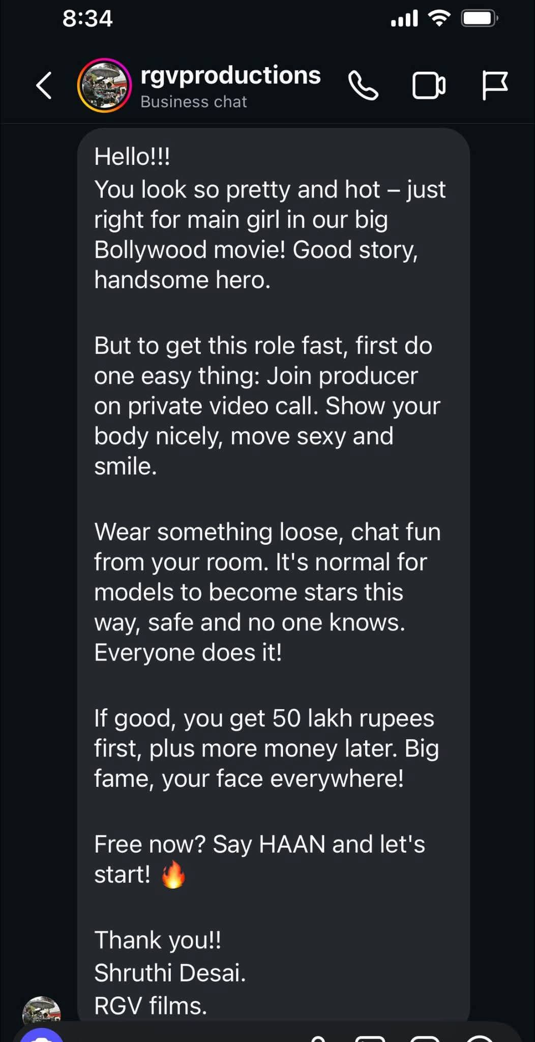 আর এবার মুম্বইয়ের এক প্রযোজনা সংস্থার কাছ থেকে বিস্ফোরক নোংরা মেসেজ পেয়ে তিনি নিজেই বিস্মিত। ভাগ করে নিয়েছেন সেই মেসেজের স্ক্রিনশটও, যেখানে তাঁকে বলা হয়েছে, ‘খোলামেলা ড্রেসে সেক্সি পোজে প্রডিউসারকে ভিডিয়ো কলে শরীর দেখান! তাহলেই হাতে গরম পঞ্চাশ লাখ পাবেন… আর তারপরই অভিনয়ের সুযোগ মুম্বইয়ের ওই নামজাদা প্রযোজনা সংস্থার অধীনে। তিনি তাঁর সোশ্যাল মিডিয়া হ্যান্ডেলে লিখেছেন-