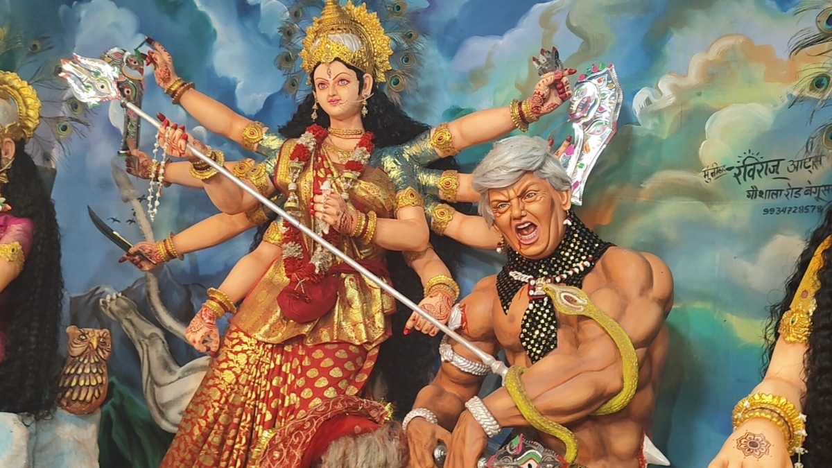 बेगूसराय में दुर्गा पूजा का अनोखा थीम, महिषासुर की जगह डोनाल्ड ट्रंप का वध कर रही हैं मां दुर्गा; देखें VIDEO