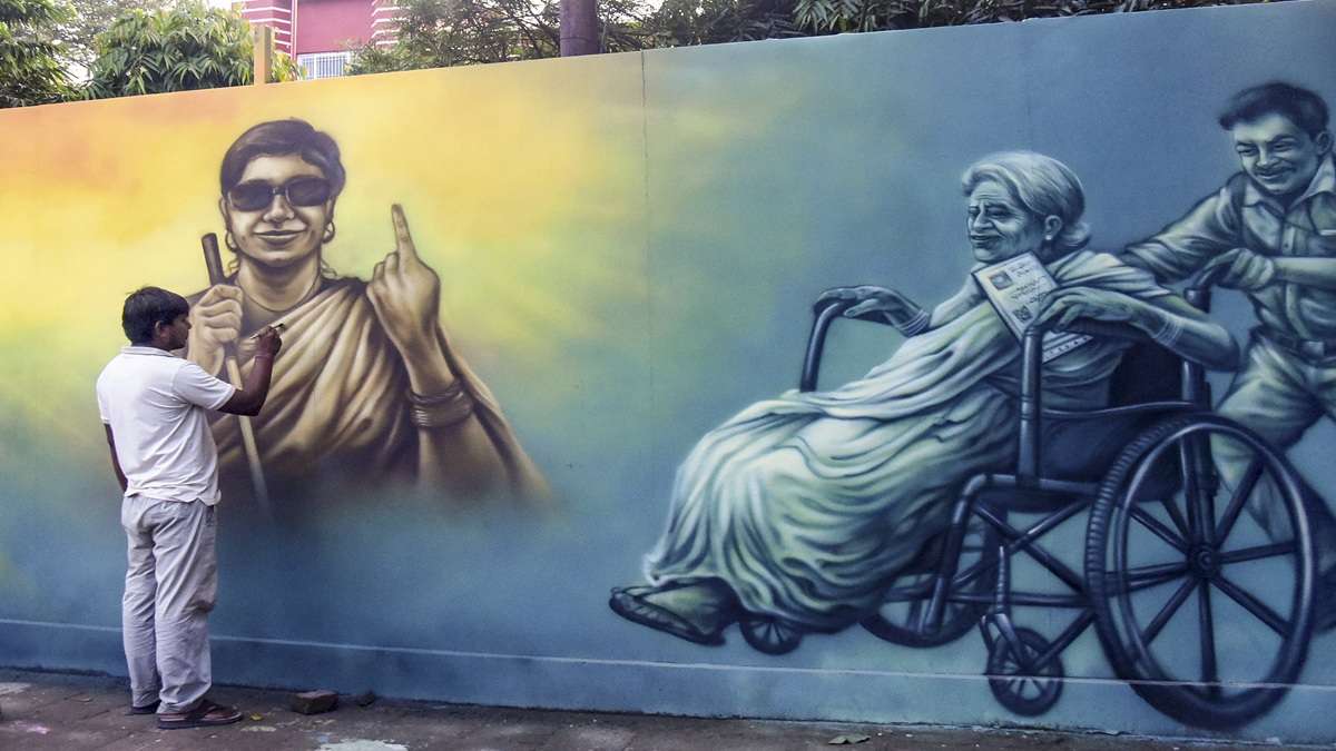 बिहार विधानसभा चुनाव से पहले पटना में एक कलाकार भित्ति चित्र बनाता हुआ।