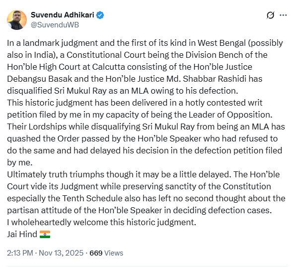 মুকুল রায়ের বিধায়ক পদ খাদিজের আবেদন নিয়ে কলকাতা হাইকোর্টে মামলা দায়ের করেছিলেন বিরোধী দলনেতা ৷ দীর্ঘদিন ধরে হাইকোর্টে মামলার শুনানি হয় ৷ বর্তমানে মামলাটি বিচারাধীন বিচারপতি দেবাংশু বসাক ও বিচারপতি মোঃ শব্বর রশিদির ডিভিশন বেঞ্চে ৷ সেই মামলার শুনানিতে দুই পক্ষের আইনজীবীরা ইতিমধ্যে লিখিত বক্তব্য জমা দিয়েছেন ৷ বিরোধী দলনেতা যে হলফনামা দিয়েছেন, তাতে স্বাক্ষর করতে শরীরে কলকাতা হাইকোর্টে এসেছিলেন নন্দীগ্রামের বিধায়ক ৷