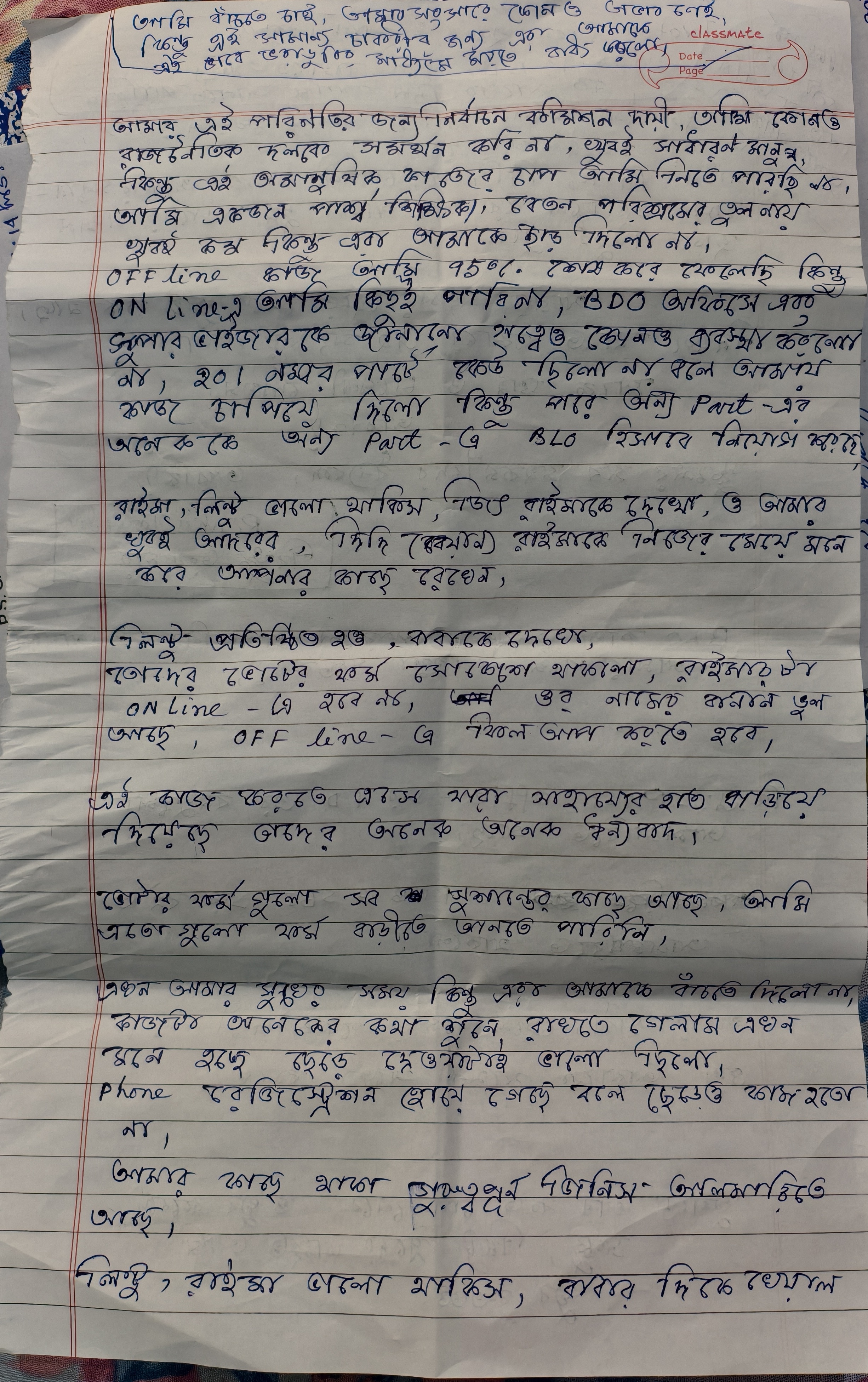 একইসঙ্গে ভোটার ফর্মগুলো কার কাছে রাখা আছে, তাও চিঠিতে জানিয়ে গিয়েছেন তিনি। নিজের সন্তানদের আগলে রাখার কথা বলেছেন আত্মীয়দের। ভাই-বোনকে বলেছেন নিজের মাকে দেখে রাখার কথাও। ধন্যবাদ জানিয়েছেন স্কুলের সহকর্মীদেরও। স্কুলের প্রতি যে তাঁর কোনও ক্ষোভ নেই, তাও স্পষ্ট তাঁর এই চিঠিতে। চিঠিতে তাঁর আতঙ্ক, ভয়, অপারগতা কথা স্পষ্ট লিখেছেন রিঙ্কু তরফদার। লিখেছেন, “বিএলও-র কাজ তুলতে না পারলে, প্রশাসনিক চাপ আসলে তা আমার পক্ষে নেওয়া সম্ভব নয়।”