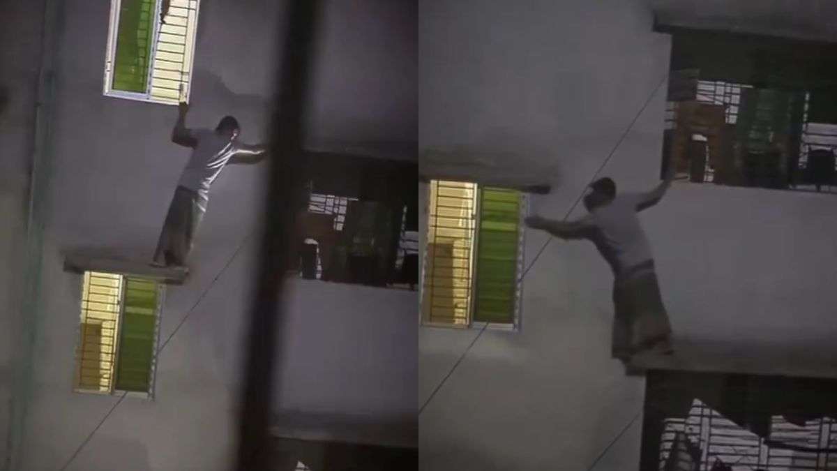 अभी जो वीडियो वायरल हो रहा है उसमें नजर आता है कि एक आदमी जिसने टी-शर्ट और लुंगी पहनी हुई है, वो किसी बिल्डिंग से उतर रहा है मगर वो सीढ़ियों से नहीं उतर रहा है। वो बिल्डिंग की सीढ़ियों के पास बने खिड़कियों से लटकते हुए उतर रहा है। अब पहले तो यह समझ में नहीं आता है कि वो ऐसा क्यों कर रहा है मगर अगले ही पल सब समझ में आ जाता है। वो कुछ लोगों से बचकर भाग रहा है क्योंकि कुछ लोग उसे पकड़ने में लगे हुए हैं। वहीं वीडियो को पोस्ट करते हुए कैप्शन में लिखा है, ‘गर्लफ्रेंड से मिलने गया था, घर वालों ने पकड़ लिया।’