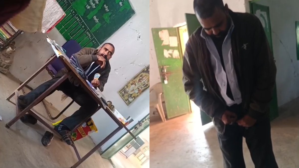 वीडियो में देखा जा सकता है कि शिक्षक की शर्ट के बटन खुले हुए हैं और उसके पैंट की जिप भी खुली हुई है। वहीं, जब दूसरा व्यक्ति उसे जिप और शर्ट की बटन बंद करने के लिए कहता है तो वह बहस करने लग जाता है।