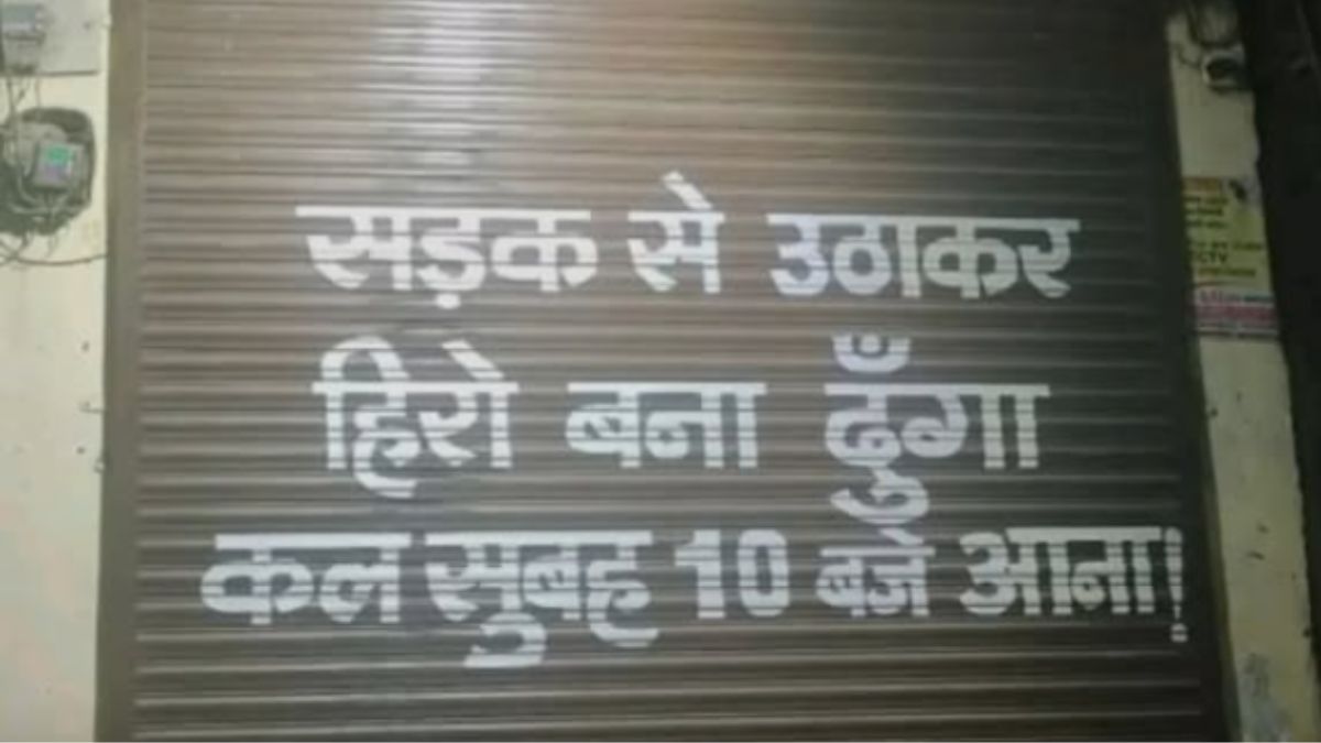 अभी जो फोटो वायरल हो रही है वो एक दुकान की है। वो कपड़े की दुकान है जहां लड़कों के कपड़े मिलते हैं। दुकान बंद है और उस बंद दुकान की शटर को देखकर ही दुकान वाले के क्रिएटिव दिमाग का पता चल पाया। दरअसल उसने अपनी शटर पर लिखवाया है, ‘सड़क से उठाकर हीरो बना दूंगा, कल सुबह 10 बजे आना।’ अब इसमें आधी लाइन तो वेलकम फिल्म से उठाई हुई है लेकिन आगे की लाइन उसकी खुद की है और यह लाइन यह बताती है कि दुकान वाले का दिमाग गजब का चलता है। फोटो इसी कारण वायरल हो रही है।