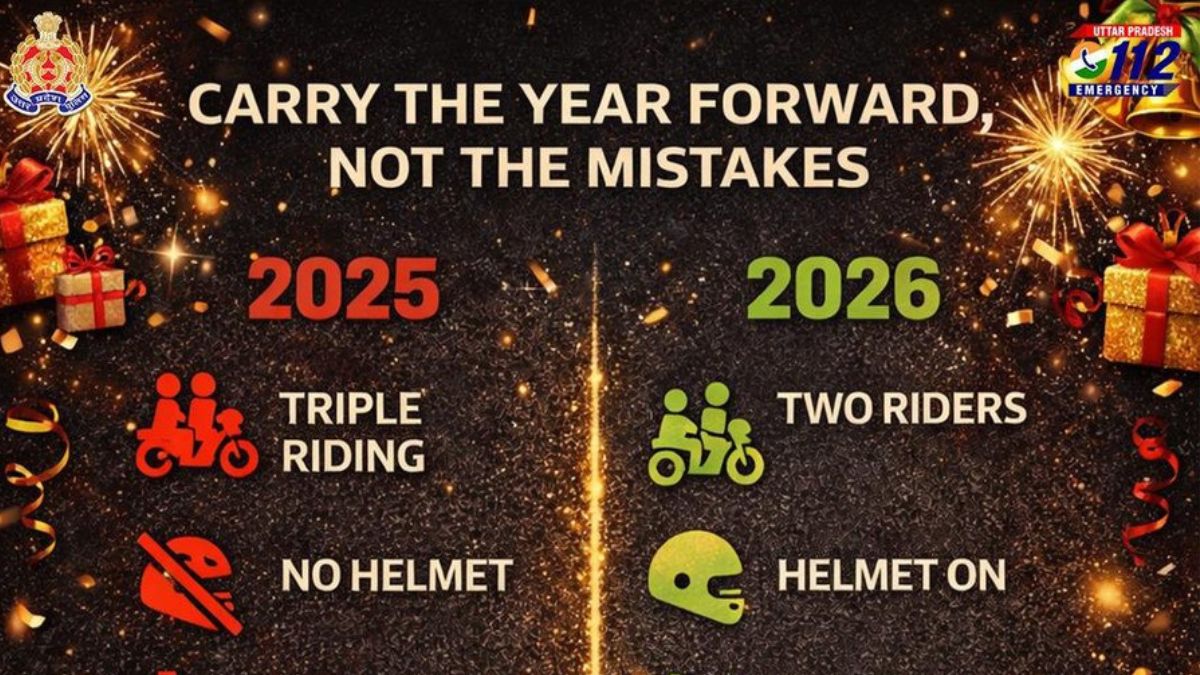 आपको बता दें कि उत्तर प्रदेश पुलिस ने एक पोस्ट बनाया है जिसमें लिखा है, ‘साल को आगे बढ़ाएं, गलतियों को नहीं।’ उसी पोस्ट में नीचे बताया है कि 2025 में ऐसा क्या किया जो 2026 में नहीं करना है। पोस्ट के मुताबिक पुलिस ने लोगों को ट्रिपलिंग करने, बिना हेलमेट के सफर करने, ड्रिंक एंड ड्राइव करने, ओवरस्पीडिंग करने और ड्राइविंग के दौरान फोन चलाने से मना किया है। वहीं कैप्शन में लिखा है, ‘टकराव(Collision) के बजाय समाधान(Resolution) चुनें। Party आधी रात को खत्म हो जाती है मगर जिम्मेदारी नहीं। हमेशा ट्रैफिक नियमों का पालन करें, साल को आगे बढ़ाएं, गलतियों को नहीं।’