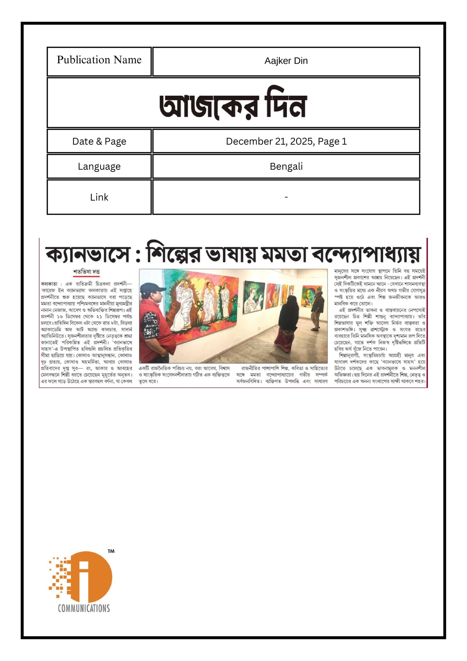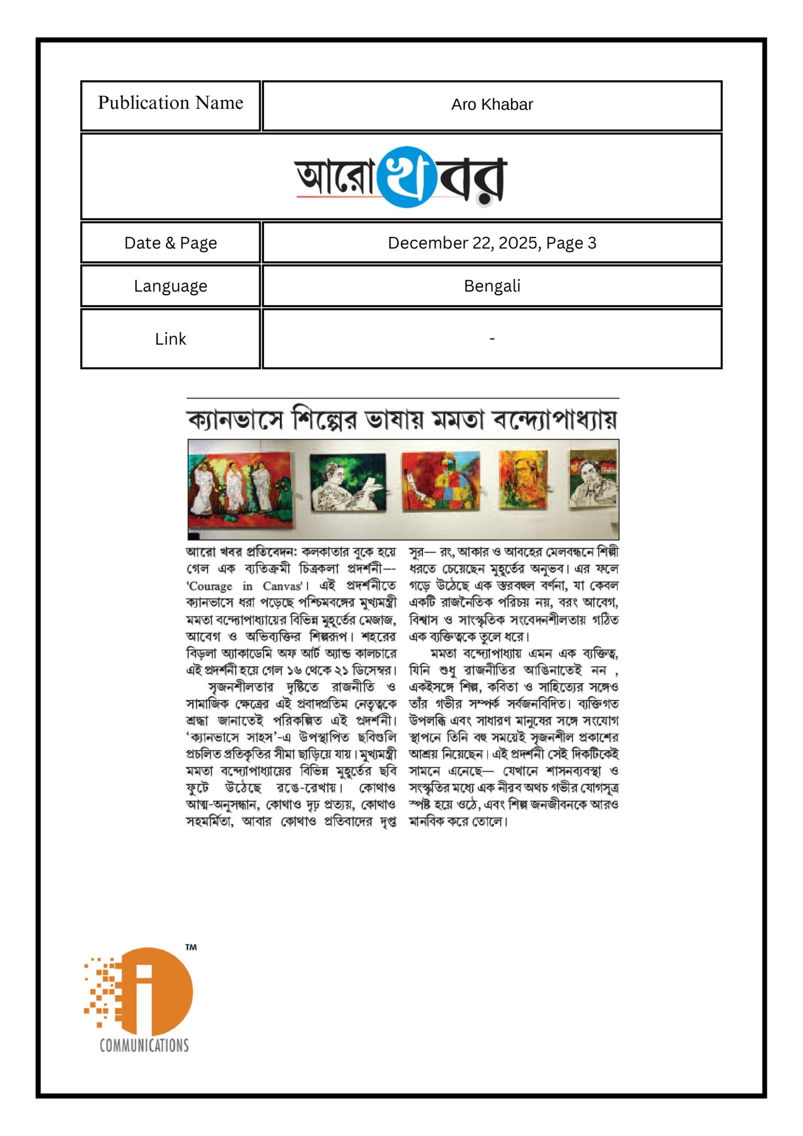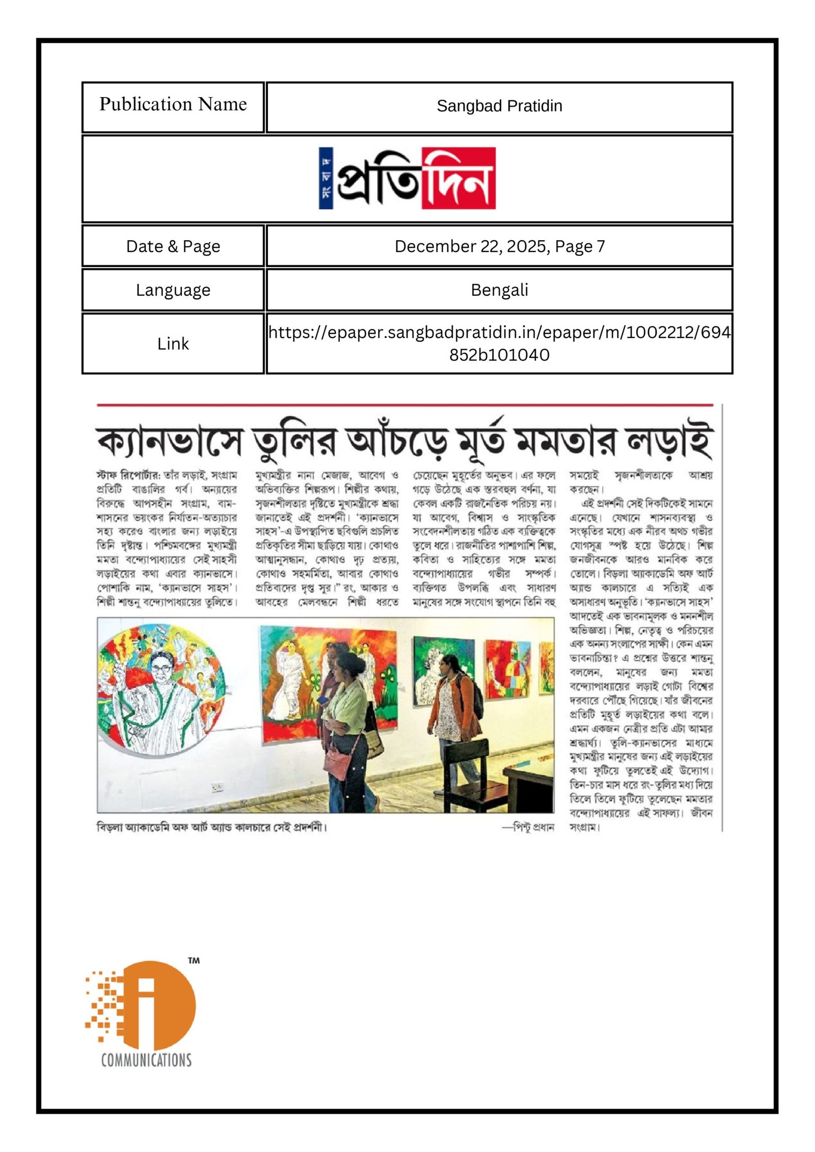 “ক্যানভাসে সাহস”-এ সাহসকে তুলে ধরা হয়েছে উচ্চকিত ঘোষণার মতো নয়, বরং এক নীরব শক্তি হিসেবে—কখনও সংযত, কখনও রঙের বিস্ফোরণে উদ্দীপ্ত, কিন্তু সর্বদা উপস্থিত। এই প্রতিকৃতিগুলি দর্শকদের আমন্ত্রণ জানায় রাজনৈতিক পরিচয়ের গণ্ডি ছাড়িয়ে কেন্দ্রে থাকা মানুষটিকে আবিষ্কার করার জন্য।
