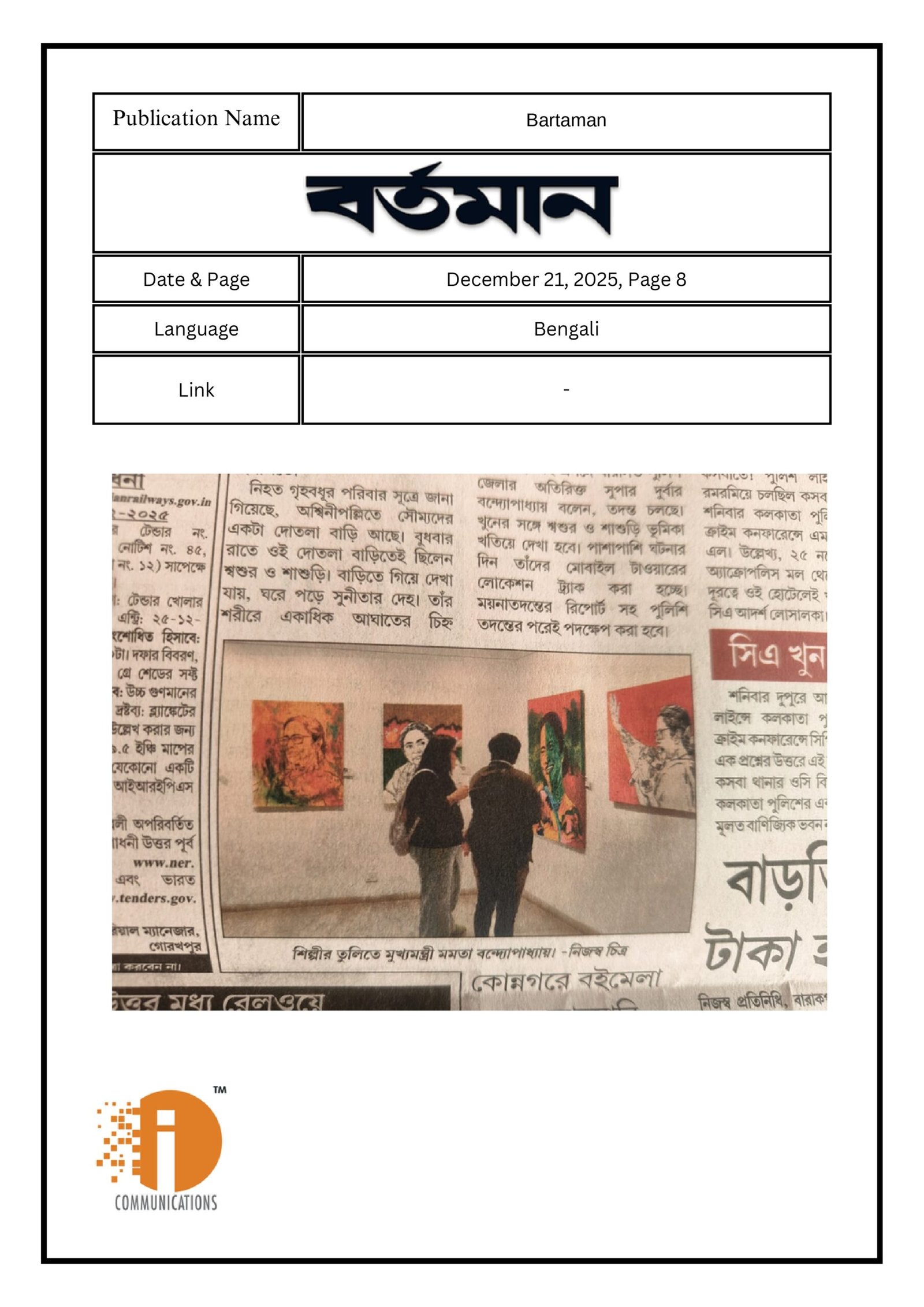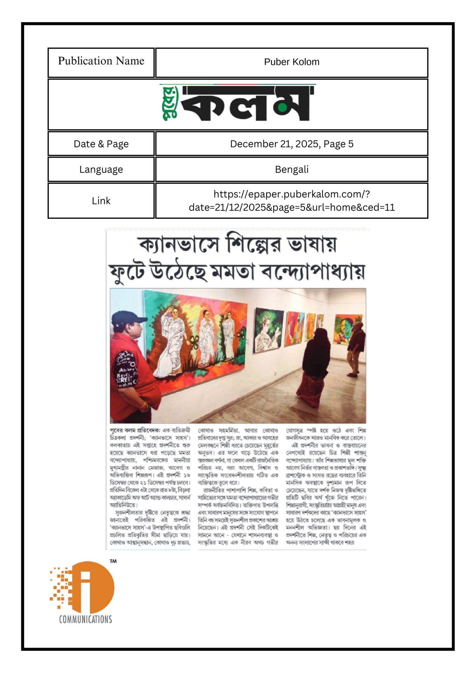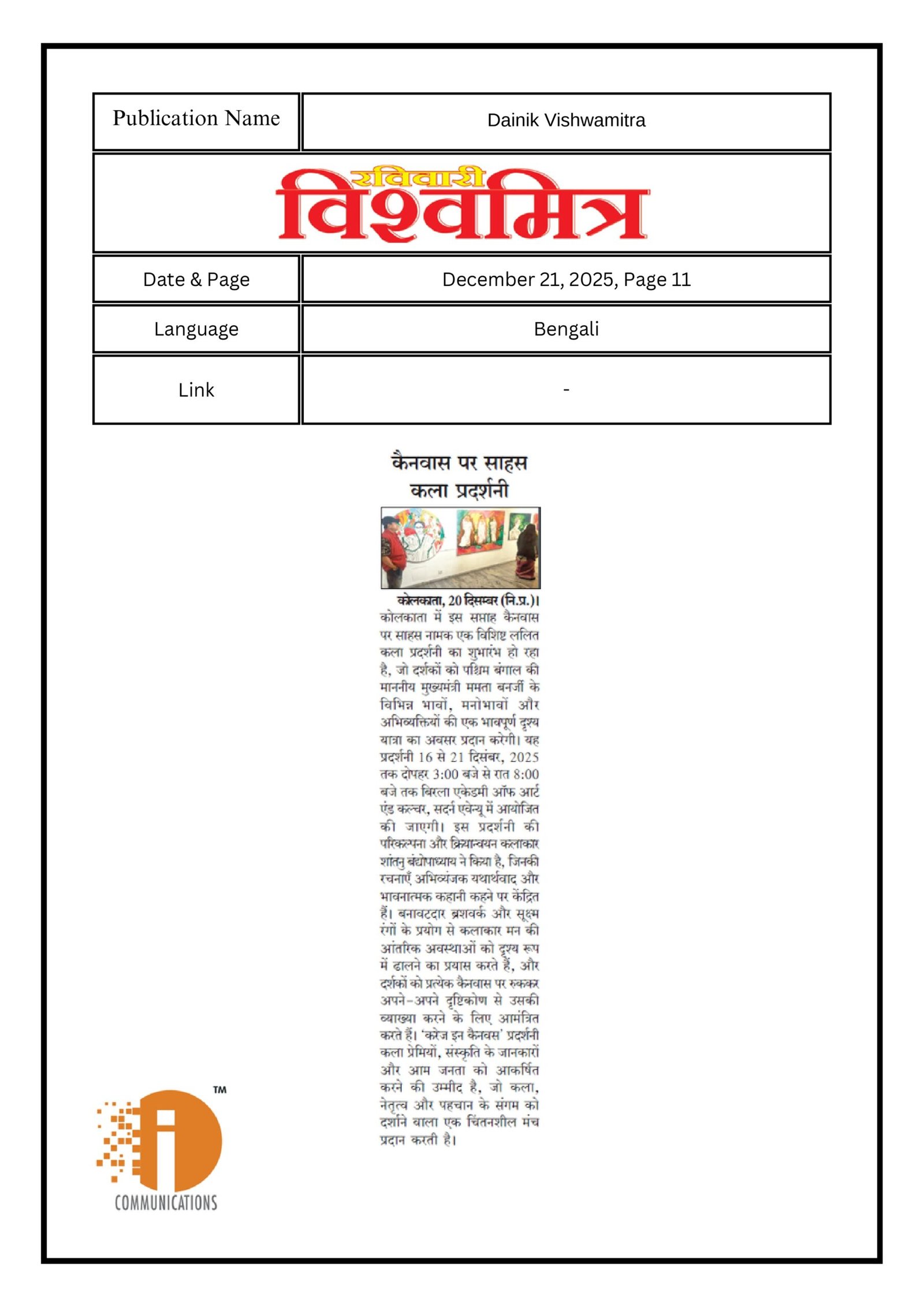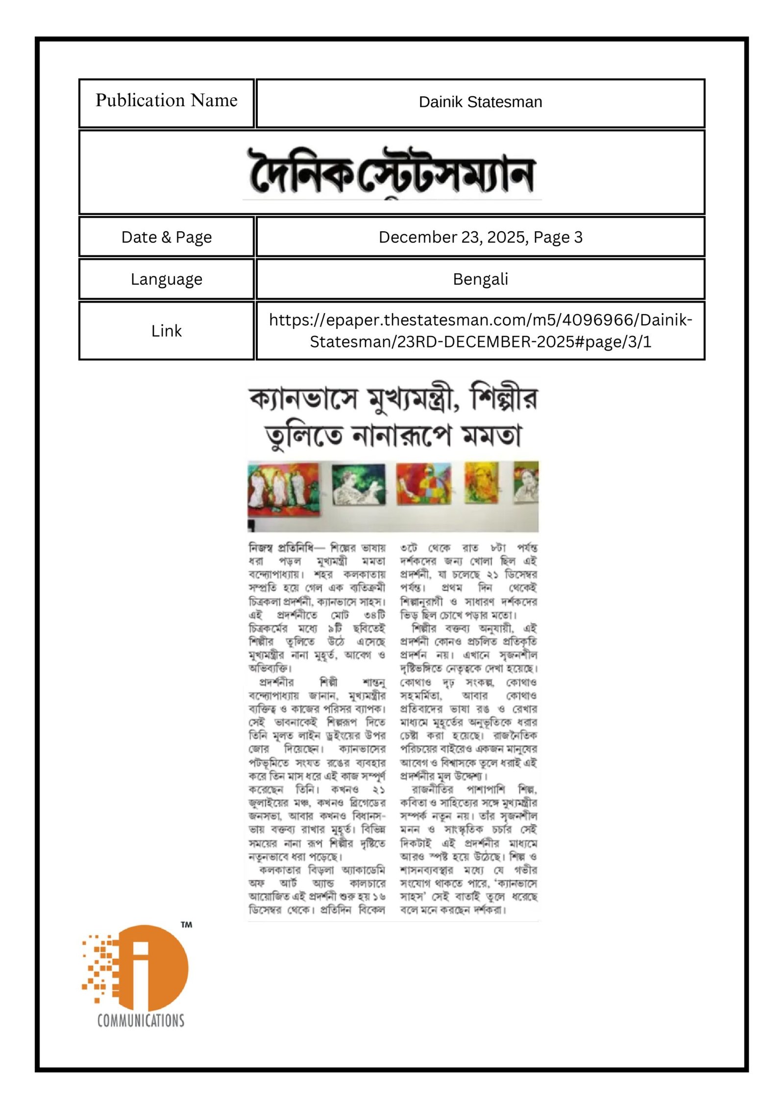 “ক্যানভাসে সাহস”-এ সাহসকে তুলে ধরা হয়েছে উচ্চকিত ঘোষণার মতো নয়, বরং এক নীরব শক্তি হিসেবে—কখনও সংযত, কখনও রঙের বিস্ফোরণে উদ্দীপ্ত, কিন্তু সর্বদা উপস্থিত। এই প্রতিকৃতিগুলি দর্শকদের আমন্ত্রণ জানায় রাজনৈতিক পরিচয়ের গণ্ডি ছাড়িয়ে কেন্দ্রে থাকা মানুষটিকে আবিষ্কার করার জন্য।