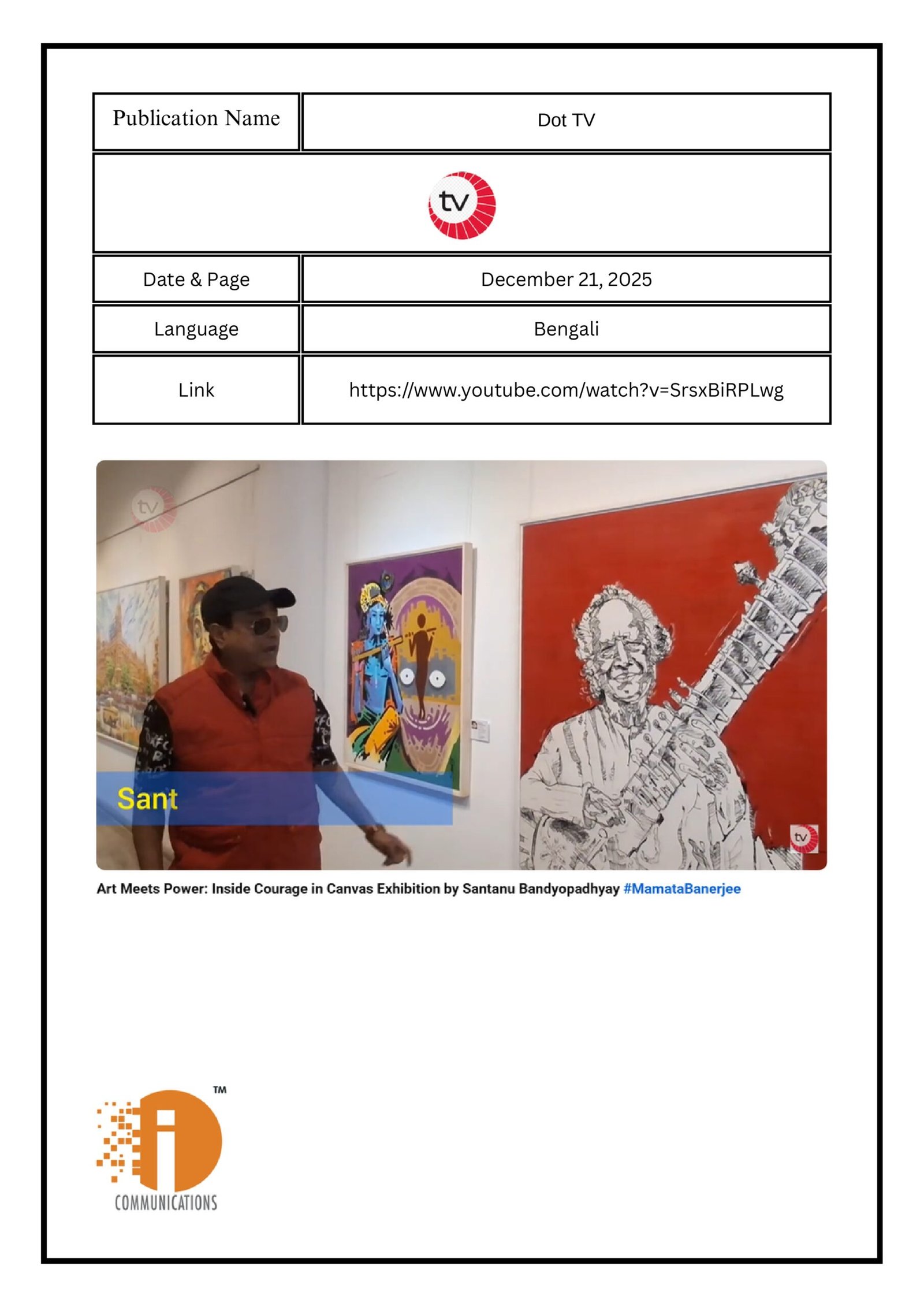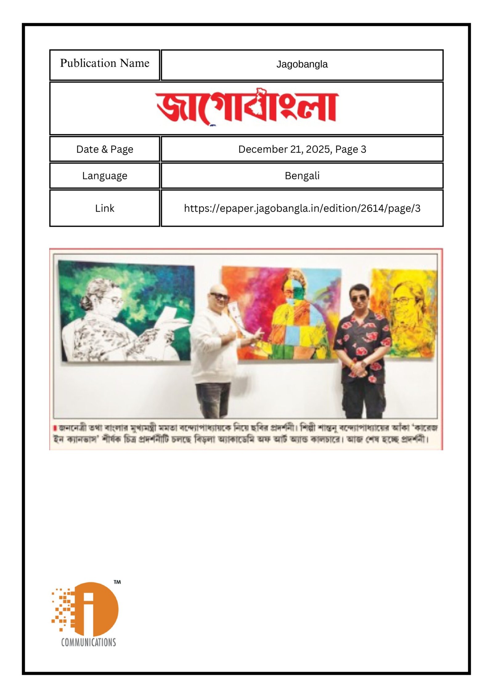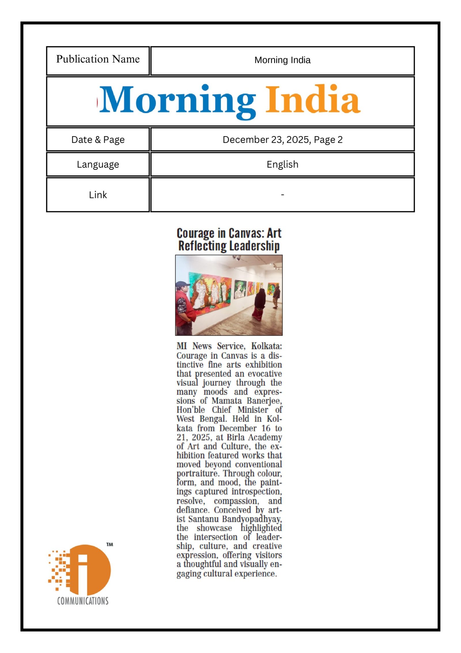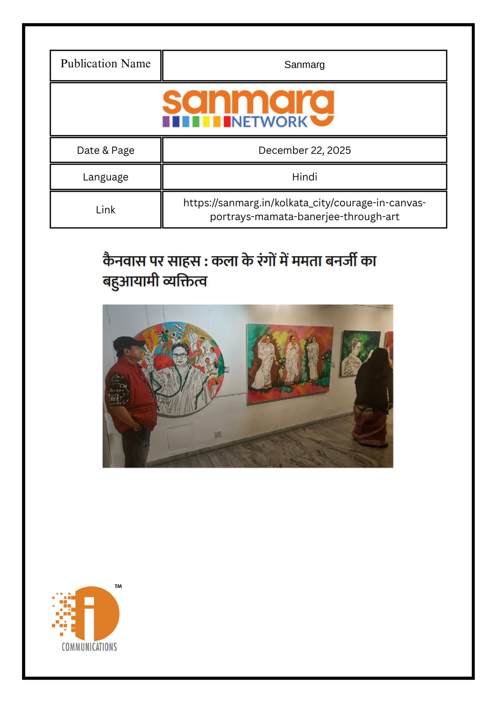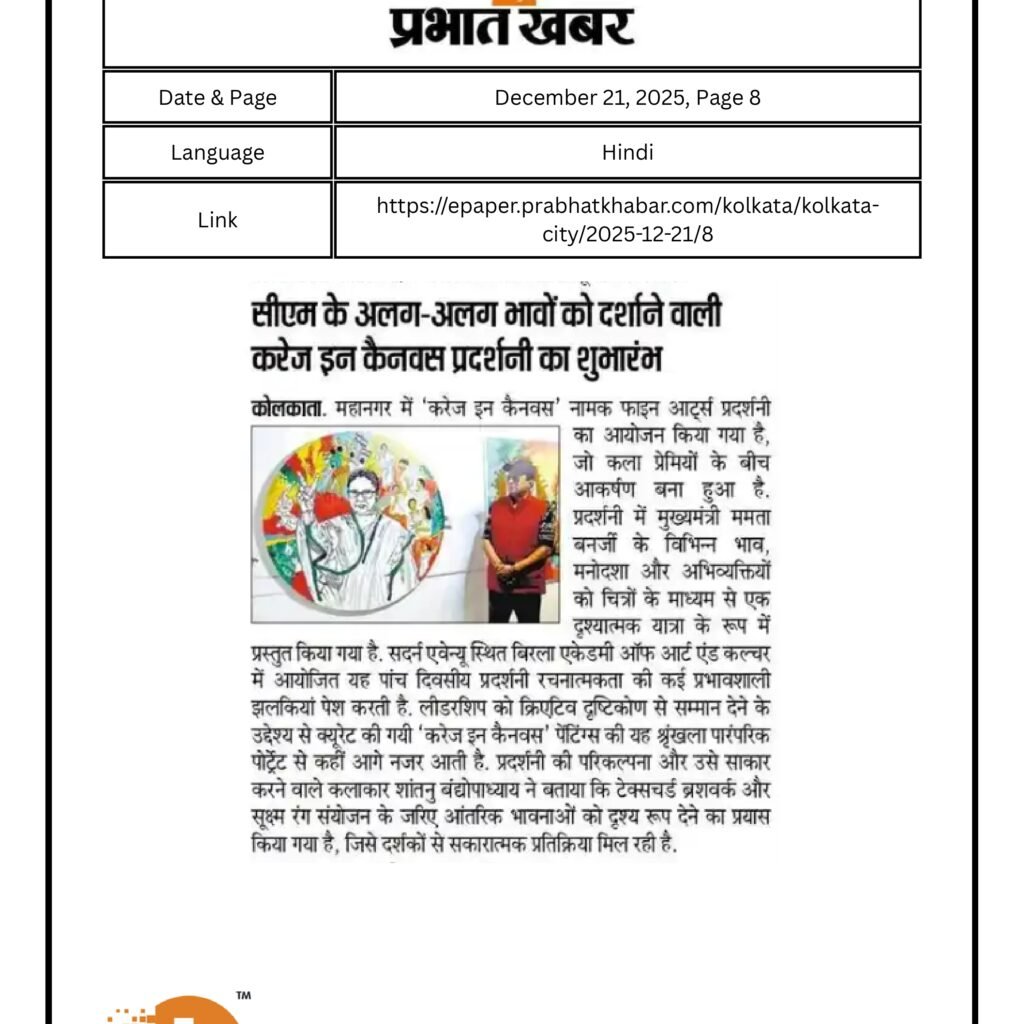 “ক্যানভাসে সাহস” শুধু একটি শিল্প প্রদর্শনী নয়—এটি নেতৃত্ব ও আবেগের মধ্যে এক অন্তরঙ্গ সংলাপ। এই আবেগময় প্রতিকৃতিগুলিতে শিল্পী সন্তনু বন্দ্যোপাধ্যায় বাংলার অন্যতম গতিশীল সমসাময়িক ব্যক্তিত্ব, মাননীয় মুখ্যমন্ত্রী মমতা বন্দ্যোপাধ্যায়কে উপস্থাপন করেছেন—যেখানে কেবল তাঁর বাহ্যিক অবয়ব নয়, ধরা পড়েছে তাঁর আবেগের পরিবর্তনশীল নানা রং ও অনুভূতি।