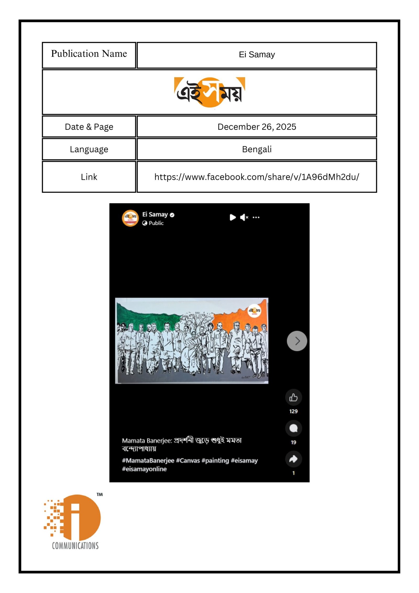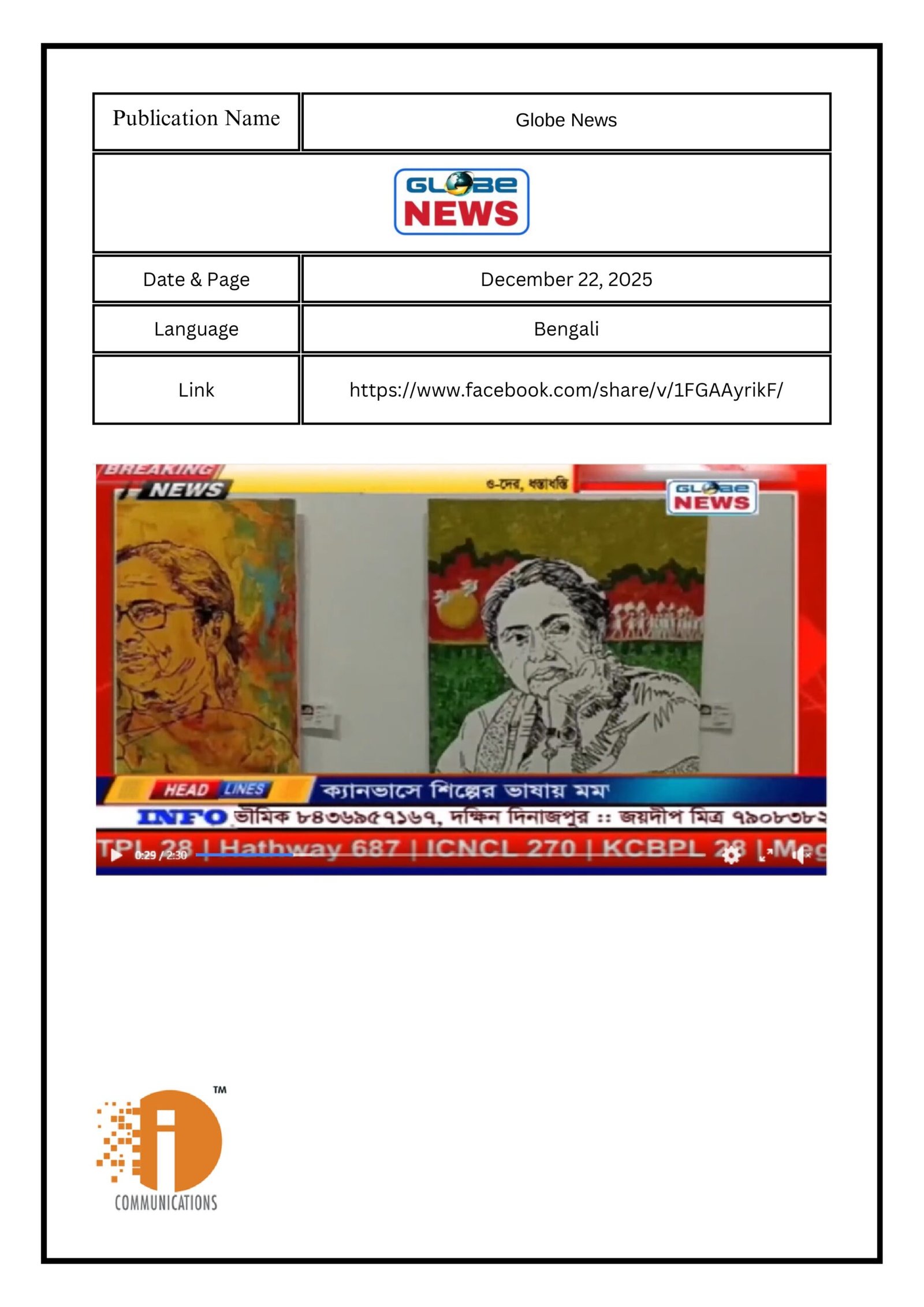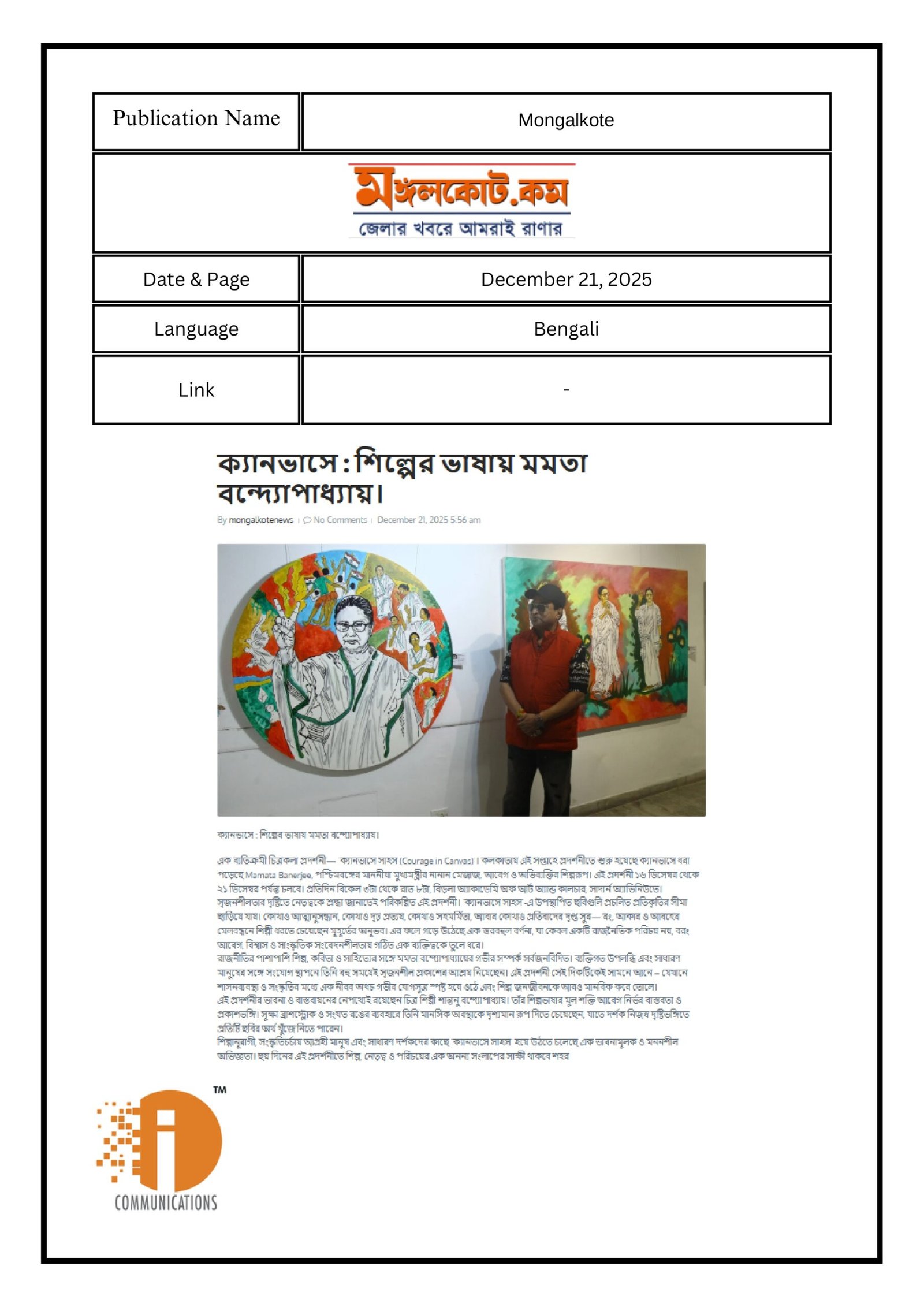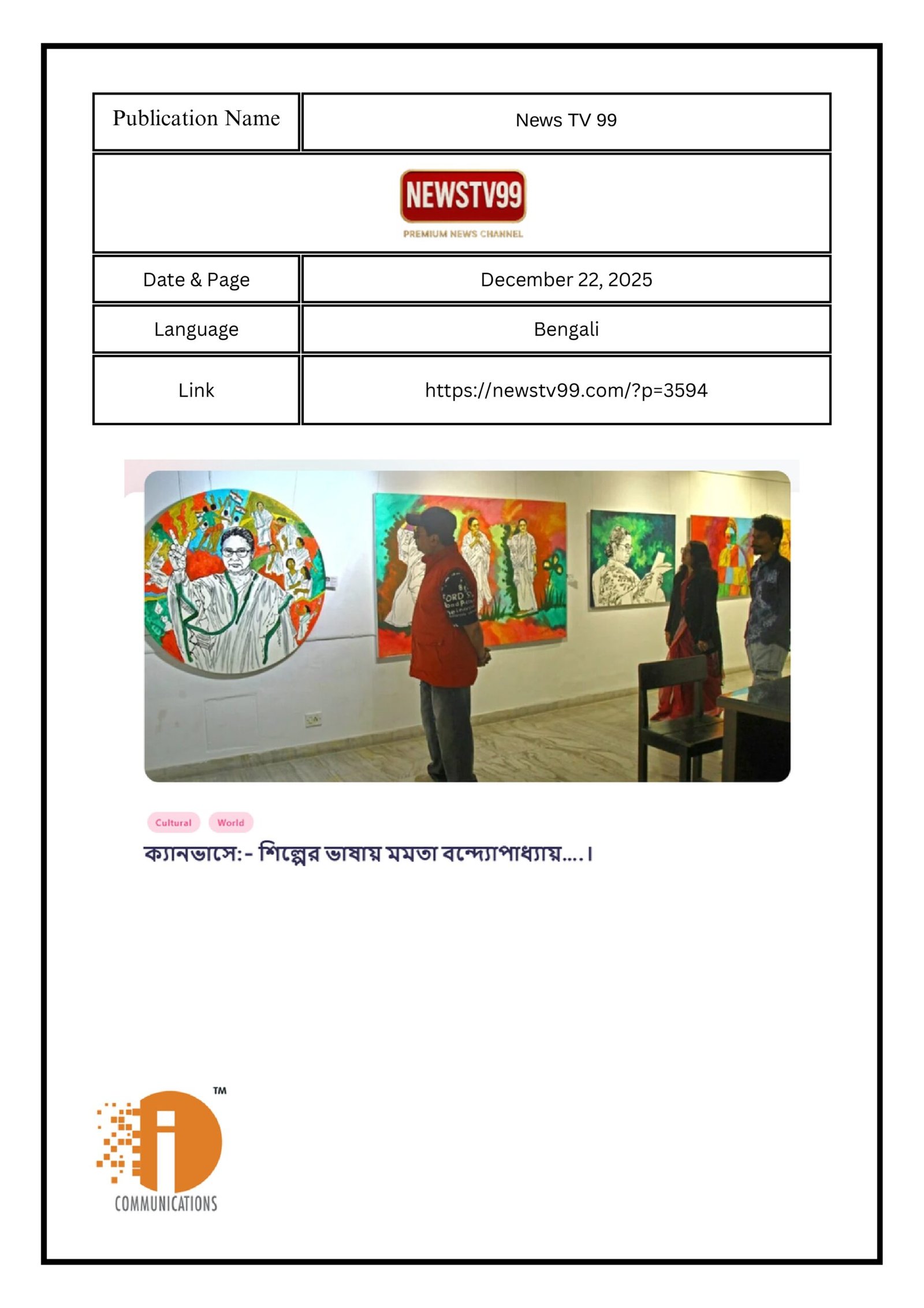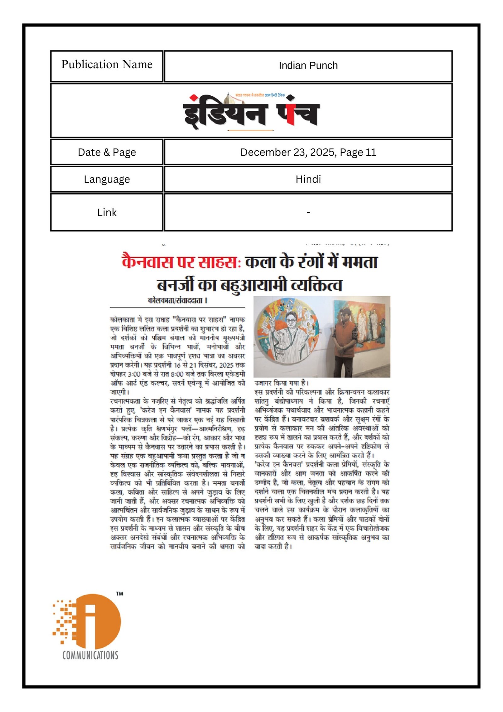 “ক্যানভাসে সাহস” শুধু একটি শিল্প প্রদর্শনী নয়—এটি নেতৃত্ব ও আবেগের মধ্যে এক অন্তরঙ্গ সংলাপ। এই আবেগময় প্রতিকৃতিগুলিতে শিল্পী সন্তনু বন্দ্যোপাধ্যায় বাংলার অন্যতম গতিশীল সমসাময়িক ব্যক্তিত্ব, মাননীয় মুখ্যমন্ত্রী মমতা বন্দ্যোপাধ্যায়কে উপস্থাপন করেছেন—যেখানে কেবল তাঁর বাহ্যিক অবয়ব নয়, ধরা পড়েছে তাঁর আবেগের পরিবর্তনশীল নানা রং ও অনুভূতি।