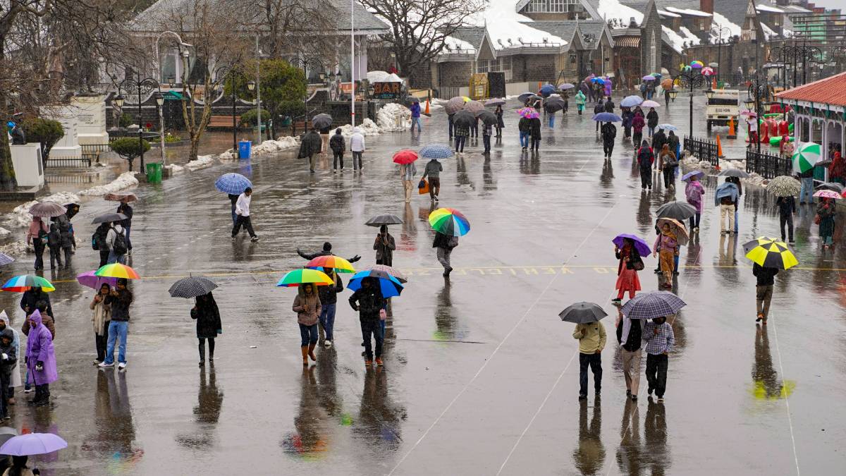 शिमला के रिज पर बारिश के बीच लोग
