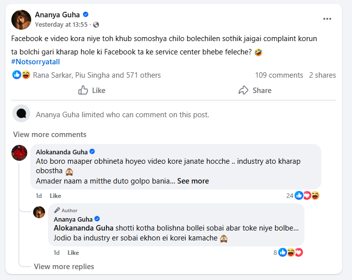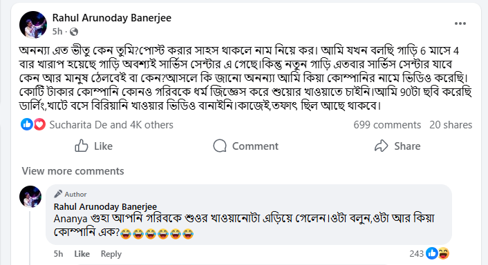 রাহুল অরুণোদয় বন্দ্যোপাধ্যায় সচরাচর চুপ থাকার পাত্র নন। অনন্যার পোস্ট নজর এড়াতেই তিনি সপাটে জবাব দেন। সরাসরি অনন্যাকে ‘ভীতু’ সম্বোধন করে রাহুল মনে করিয়ে দেন কন্টেন্ট এবং কেরিয়ারের পার্থক্য। রাহুল লেখেন, “অনন্যা এত ভীতু কেন তুমি?পোস্ট করার সাহস থাকলে নাম নিয়ে করো। আমি যখন বলছি গাড়ি 6 মাসে ৪ বার খারাপ হয়েছে গাড়ি অবশ্যই সার্ভিস সেন্টারে গেছে। কিন্তু নতুন গাড়ি এতবার সার্ভিস সেন্টার যাবে কেন আর মানুষ ঠেলবেই বা কেন? আসলে কি জানো অনন্যা আমি কিয়া কোম্পানির নামে ভিডিও করেছি। কোটি টাকার কোম্পানি, কোনও গরিবকে ধর্ম জিজ্ঞেস করে শুয়োর খাওয়াতে চাইনি। আমি ৯০টা ছবি করেছি ডার্লিং,খাটে বসে বিরিয়ানি খাওয়ার ভিডিও বানাইনি। কাজেই,তফাৎ ছিল আছে থাকবে।”