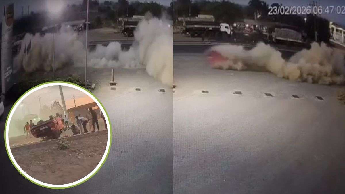 वीडियो में साफ दिख रहा है कि लाल कलर की स्विफ्ट कार फूल स्पीड से आती है। कुछ ही सेकेंड में कार ने कई बार पलटी लगाई और फिर जाकर रुक गई। हादसे के वक्त कार के अंदर से सफेद धुआं निकलने लगा, जो कि पूरे रोड और आसपास छा गया।